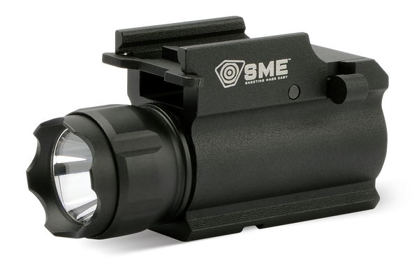 Get a 165 yard beam distance with the sme rail mounted pistol light.It mounts to your pistol's bottom rail with a spring clamp lock.The light is constructed of aluminum with an optimized projection cup, features a cree led bulb and is water resistant.Included is one cr123 battery.