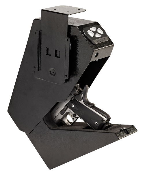 Snapsafe's drop box compact vault mounts under a counter or desk, or on the side of a nightstand for quick access to your handgun.It features a programmable 4 to 6 digit keypad, fast action, tamper resistant drop-down door, and a protective foam liner safeguards your handgun from scrapes and scratches.This model is constructed of 16-gauge steel for exceptional durability and the mounting bracket allows multiple orientations.