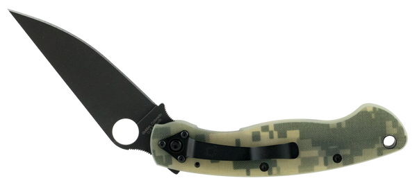 The military ergonomics meet the requirements of a high-performance, light-weight folder designed for hard use.The "millie" has a modified clip-point blade laser cut with a 14mm spyderco round hole for quick deployment and for use with gloves.Texturing above the hole holds the thumb in contact with the blade's spine during cutting for confident control over the sharpened edge.The handle flares slightly at the front end creating a finger choil and at the butt end, which keeps the knife from slipping forward or backward in the hand while sawing or making tough or aggressive cuts.A contoured black metal clip is set for right-hand tip-down carry.