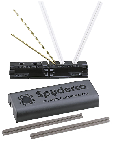 Spyderco's tri-angle sharpmaker includes two sets of high alumina ceramic 7" stones: medium grit for aggressive sharpening and fine grit for professional-grade finishing.Stones fit into keyed holes and a set of brass safety rods protect the user's hand during sharpening.The triangular shape allows honing of serrated and plain edges.Slots molded into the polymer base have a 40- and 30-degree angle for knives and a 12.5-degree...View more