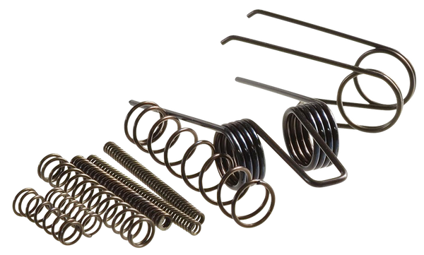 The strike industries m?4ar-15 lower receiver spring replacement kit includes 9 important springs that are commonly replaced or easily lost when building stripped lower receivers.The 9-piece kit includes springs for the bolt catch, disconnector spring, buffer retainer spring, trigger spring, hammer spring, magazine catch spring, selector spring and two detent springs.