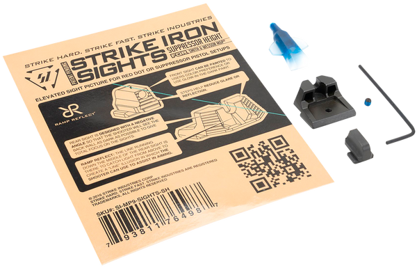 The strike iron sights (suppressor height) give you an elevated sight picture for a red dot or suppressor pistol setup.The front and rear sights sit at an absolute co-witness position with a slide mounted red dot.Designed to help with proper sight alignment and keep the shooter's eyes focused, there is natural light that is seen on both sides of the front sight between the u-notch...View more
