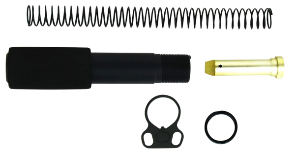 Tacfire's ar15 pistol buffer tube kit includes- mil-spec pistol buffer tube w/foam insert, buffer, carbine length buffer spring, dual loop sling adapter end plate and castle nut.