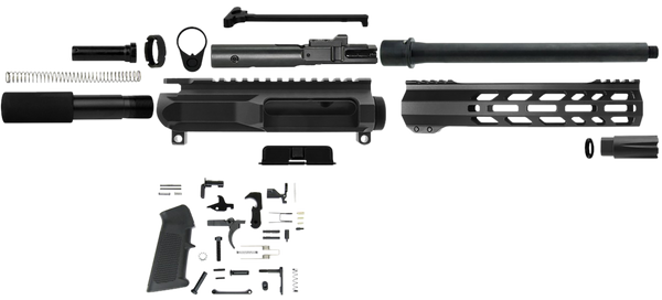 Includes: (1).45acp 10" barrel usa made (1) 45acp bolt carrier group (1) slick side upper receiver usa made (1) slim free float mlok hand guard 10" (1) complete lower parts kit usa made (1) standard receiver end plate (1) mil-spec/commercial castle nut/steel (1) mil-spec pistol buffer tube/alum.W/foam cover (1) heavy buffer (1) buffer tube spring (1) mil-spec charging handle (1) dust cover (1) forward assist (1) 5/8x24 linear compensator