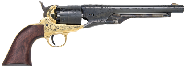 Recognized as the mainstay of the union army, the 1860 was ordered to fill the ranks.The.44 caliber revolver was as powerful as it was popular, and could long be found in army posts and across the frontier following the civil war.This 1860 army engraved revolver has an 8" round barrel, blued frame, brass trigger guard, and walnut grip.