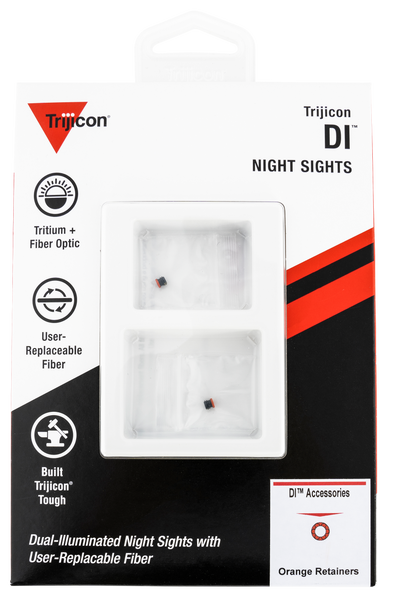 Designed for shooters who want daylight brightness and a constant aiming point, the dual illuminated trijicon di night sights are equipped with an industry-first, interchangeable fiber.This patent pending design not only allows the ability to replace the fiber in the field, it allows the user to choose among several fiber and ring retainer colors to configure a personalized aiming solution.This kit includes 2 orange di retainers and a t10 torque l-key.