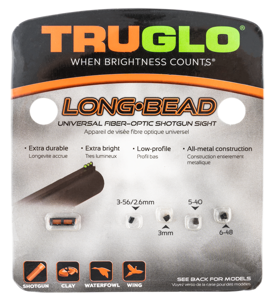 The long bead by truglo is cnc-machined, and it's the industry's favorite bead replacement.This shotgun sight is green, with a fiber of 0.078" in diameter and 0.5" in length.This model includes different size mounting screws.*note- designed only to be installed on a shotgun barrel with a ventilated or solid rib design.