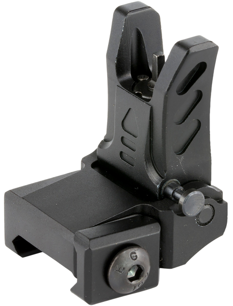 Leapers spring-loaded low profile flip-up front sight for the ar15 is constructed of aluminum with a anodize black finish with a low profile.Spring-loaded posi-lock push button activation automatically deploys sight tower and prevents sight tower from collapsing when deployed.Uses standard a2 front sight post, interchangeable with other aftermarket posts with equivalent dimensions.Utilizes a single locking torx screw with low profile mounting base.Uses 3mm locking bolt and mounting deck, torx locking plate recommended torque value: 35 in-lbs.Requires sight tool.Front sight post width:0.07", post height: 0.26".
