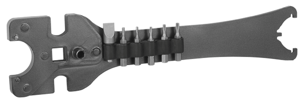 The wheeler basic armorer's wrench will cover most of your ar-15 service needs with a single tool.An innovative layered and laminated stamped steel construction makes the tool durable.This construction method allows the use of hardened steel barrel nut pins designed to hold up to heavy torque requirements.A cut out for a 1/2" drive allows the tool to be used with a torque wrench or ratchet driver.Profiles for buffer tube lock nut and flash hider are included.The addition of a bit driver and bit holder with six common bits adds to the versatility.