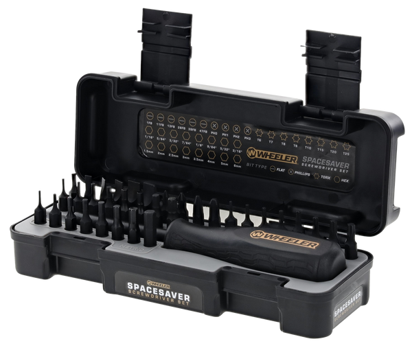 Small but mighty, the wheeler 36 piece spacesaver screwdriver set provides a convenient assortment of sae and metric hex, torx, phillips, and flat bits, perfect for common household tasks.The 1/4" drive handle features a texturized rubber grip for a secure hold and a magnetized tip for easily changing bits.
