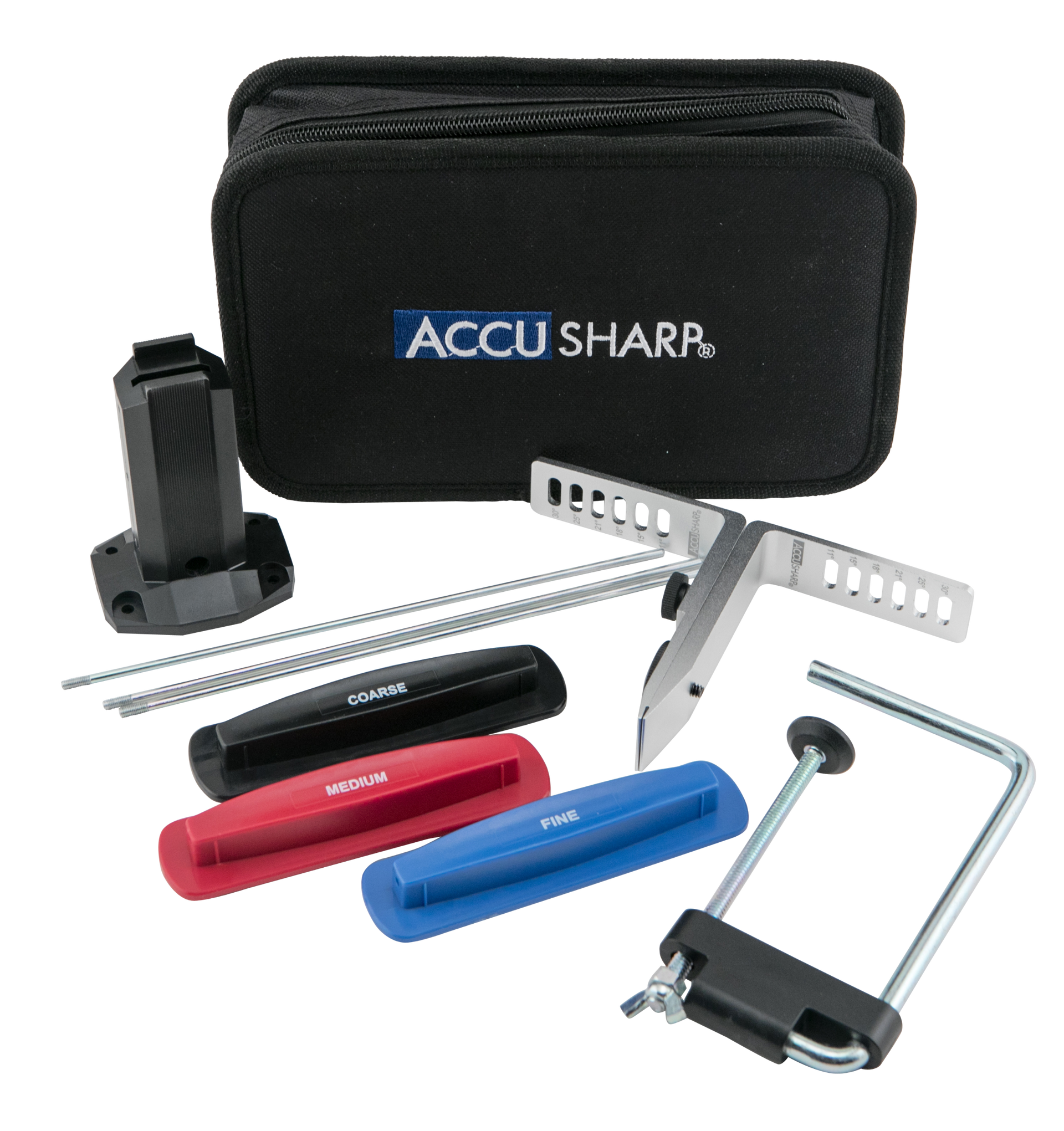 The accusharp precision sharpening kit allows you to manually sharpen your knives at a consistent, exact, fixed angle.This kit provides precision sharpening designed to maintain accurate results for your knifes specific edge.The accusharp precision sharpening kit is equipped with six angle and three stone options to keep your knifes edge razor sharp.Knife clamp has settings for 11, 15, 18, 21, 25 and 30 degree angles.Grits...View more