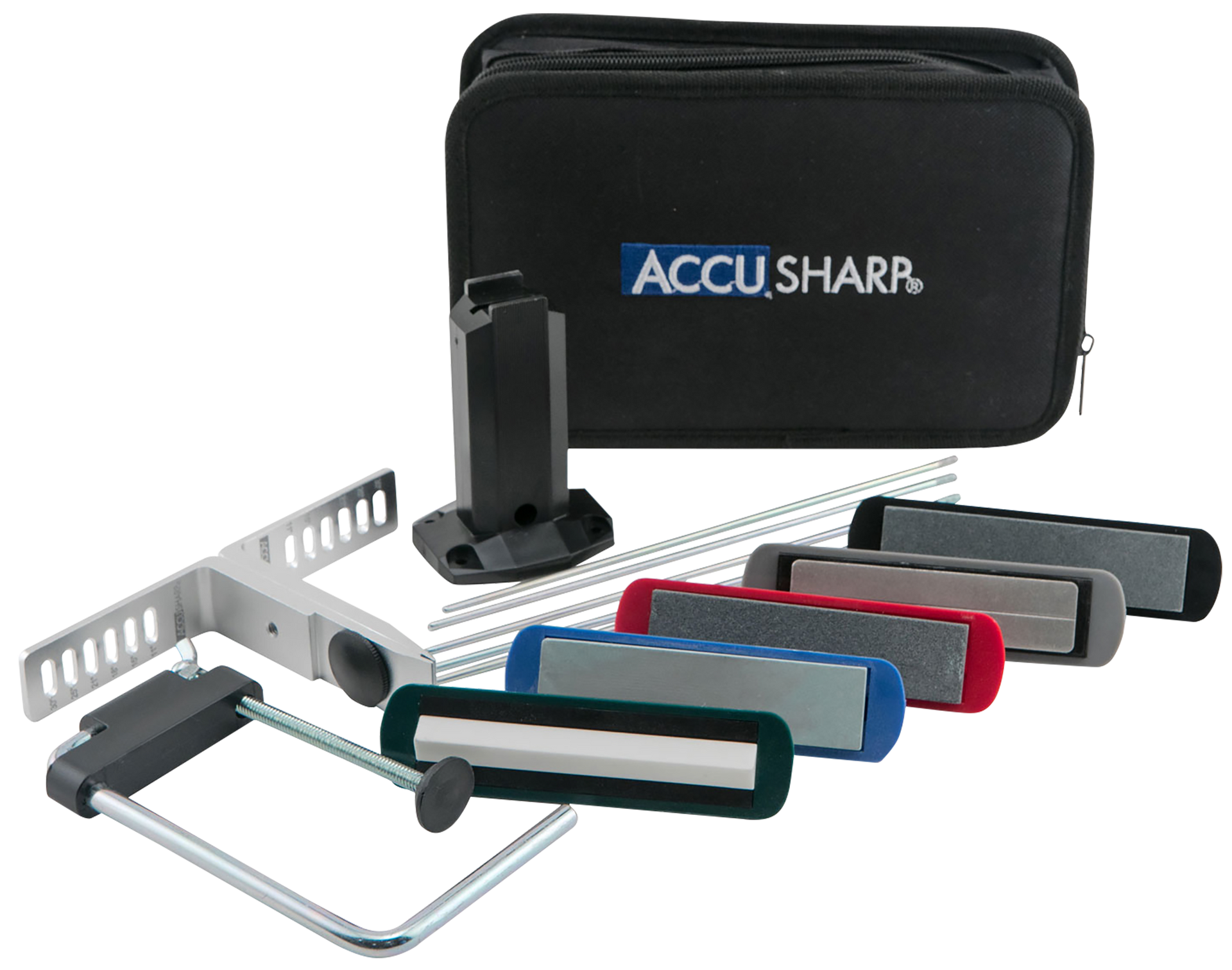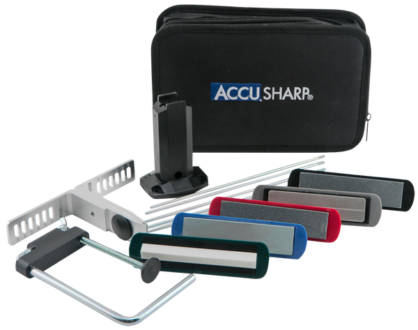 The accusharp precision sharpening kit allows you to manually sharpen your knives at a consistent, exact and fixed angle.This kit provides precision sharpening designed to maintain accurate results for your knifes specific edge.The accusharp precision sharpening kit is equipped with six angle and five stone options to keep your knifes edge razor sharp.Knife clamp has settings for 11, 15, 19, 21, 25 and 30 degree angles.Grits diamond coarse 320, coarse 120, medium 180, fine 280 and ceramic fine 1500.