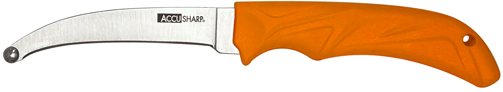 The accusharp accuzip skinning knife is the ultimate knife for game processing.This 420 stainless steel knife, cuts underneath the skin without cutting through hair.The blunt tip feature prevents the knife from puncturing internal organs which can spoil the meat.The ergonomically designed handle in blaze orange is made with a non-slip rubber grip for comfort and ease of use.Includes a nylon sheath and belt loop.