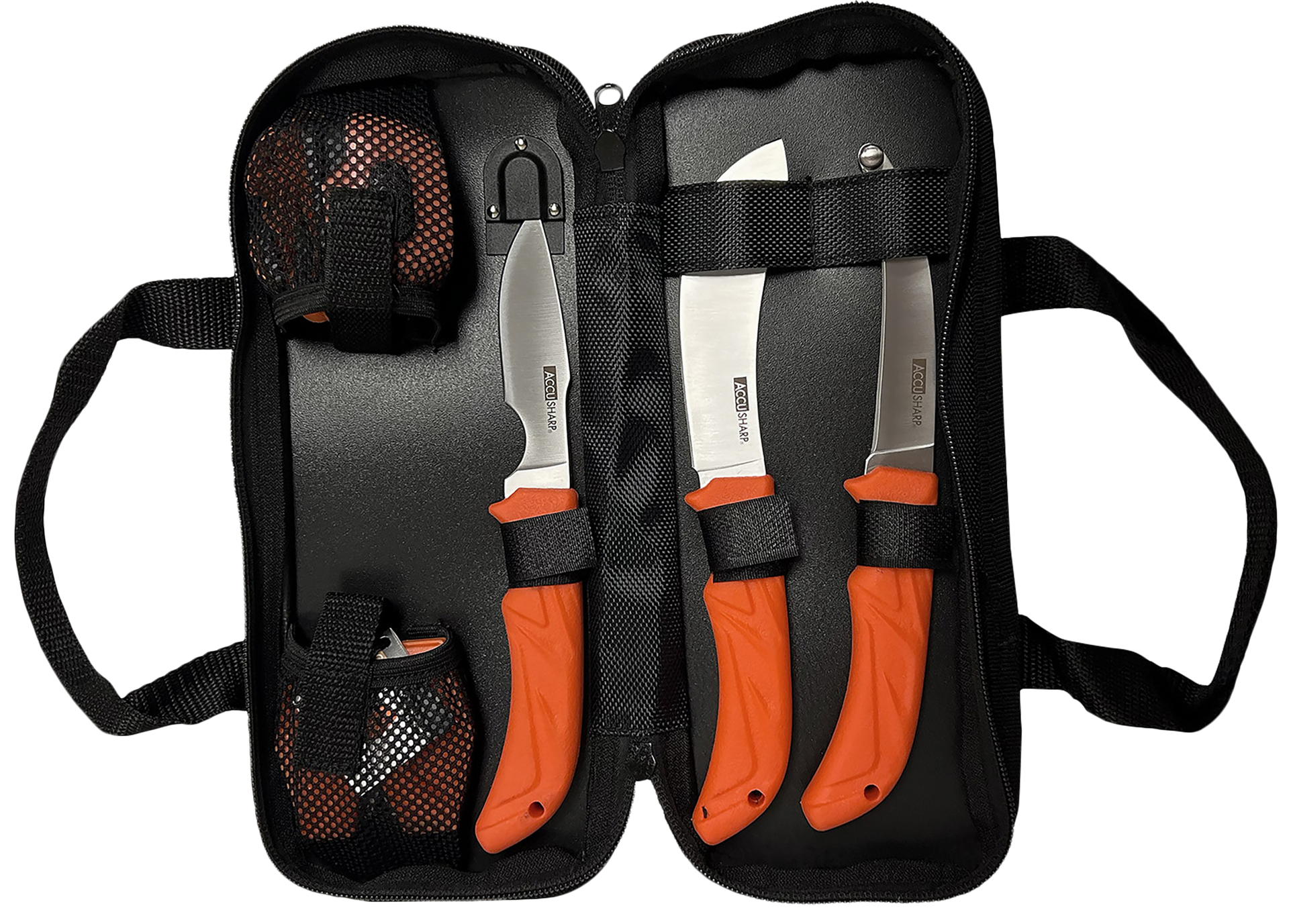 The accusharp 6-piece processing kit comes with a 3" caping knife, 4" gutting knife, 4" butcher knife, led head lamp w/four light modes, 2-step carbide-ceramic knife sharpener and a compact nylon carrying case.The stainless steel knives have a non-slip grip.