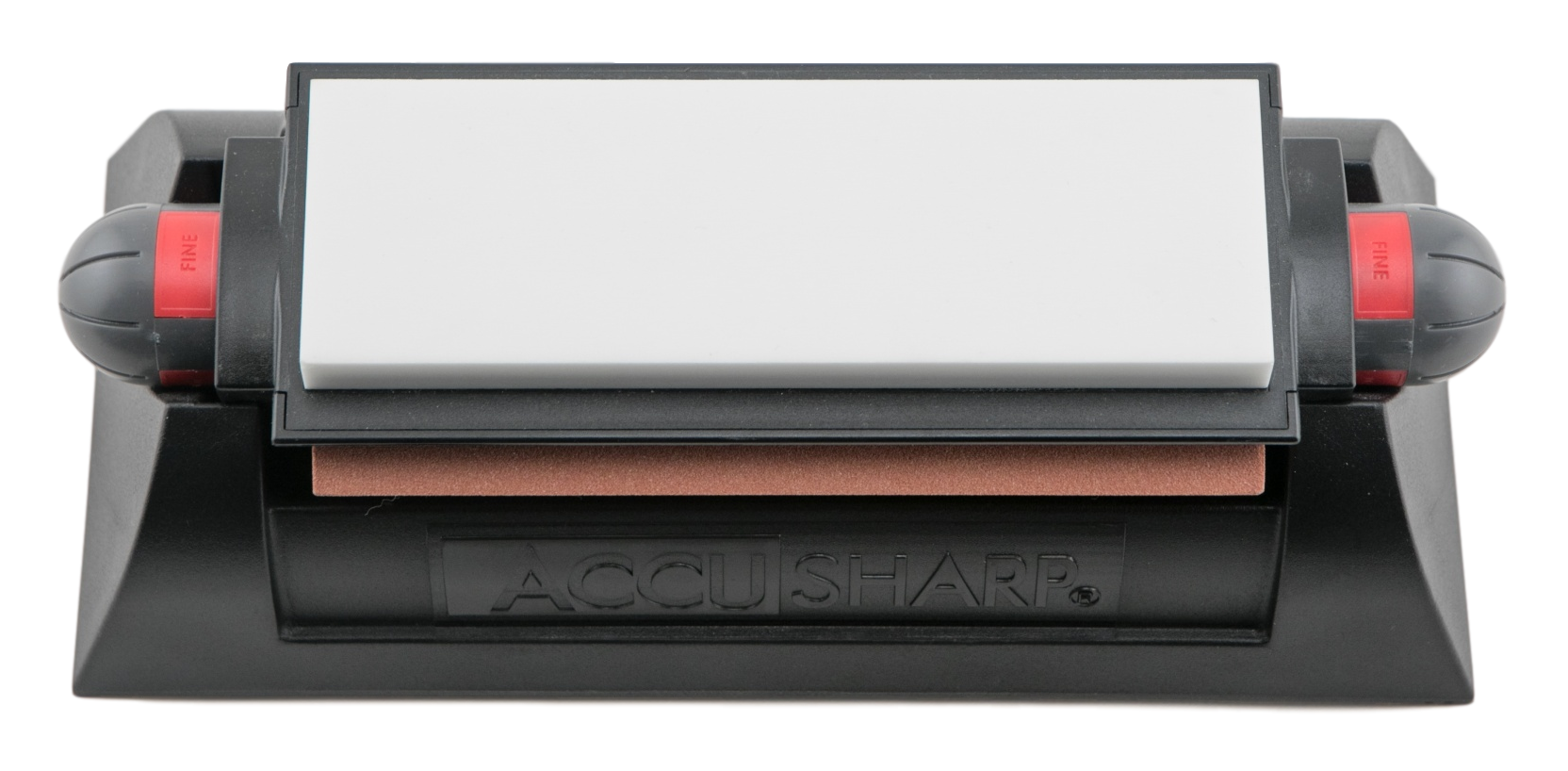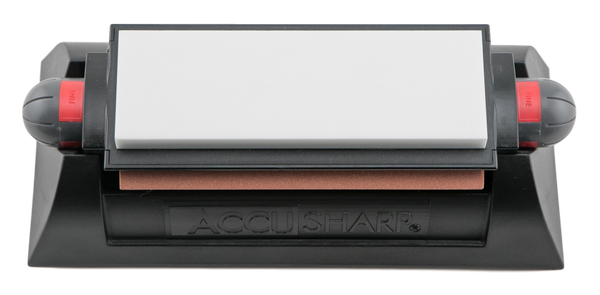 The accusharp deluxe tri-stone knife sharpening system features a course diamond-coated steel allowing you to easily sharpen and hone any straight-edge blade with ease.Accusharps three stone surfaces include coarse diamond, medium alumina-oxide and fine ceramic.This tri-stone system provides extra durability and safety on any surface with a rubber-grip base which prevents sliding while sharpening and honing your knives.Additionally, the deluxe tri-stone sharpener base can be mounted to most countertops for extra stability.Includes an angle guide to assist in maintaining a consistent angle while sharpening.Grits diamond coarse 320, synthetic medium 280, ceramic fine 1500.