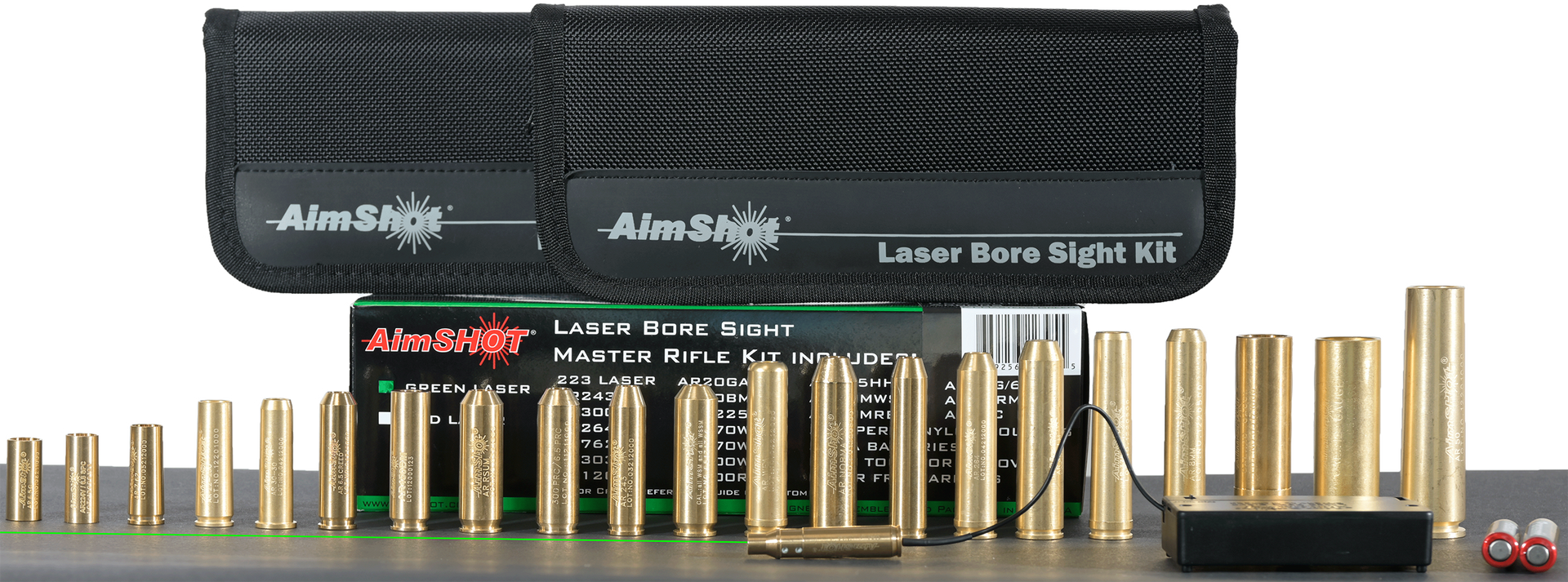 Aimshot's bore green laser master kit is perfect for outdoor applications.This kit includes a 223 laser bore sight and all of our 16 different rifle arbors.You will be able to bore sight just about every common caliber rifle with this kit.