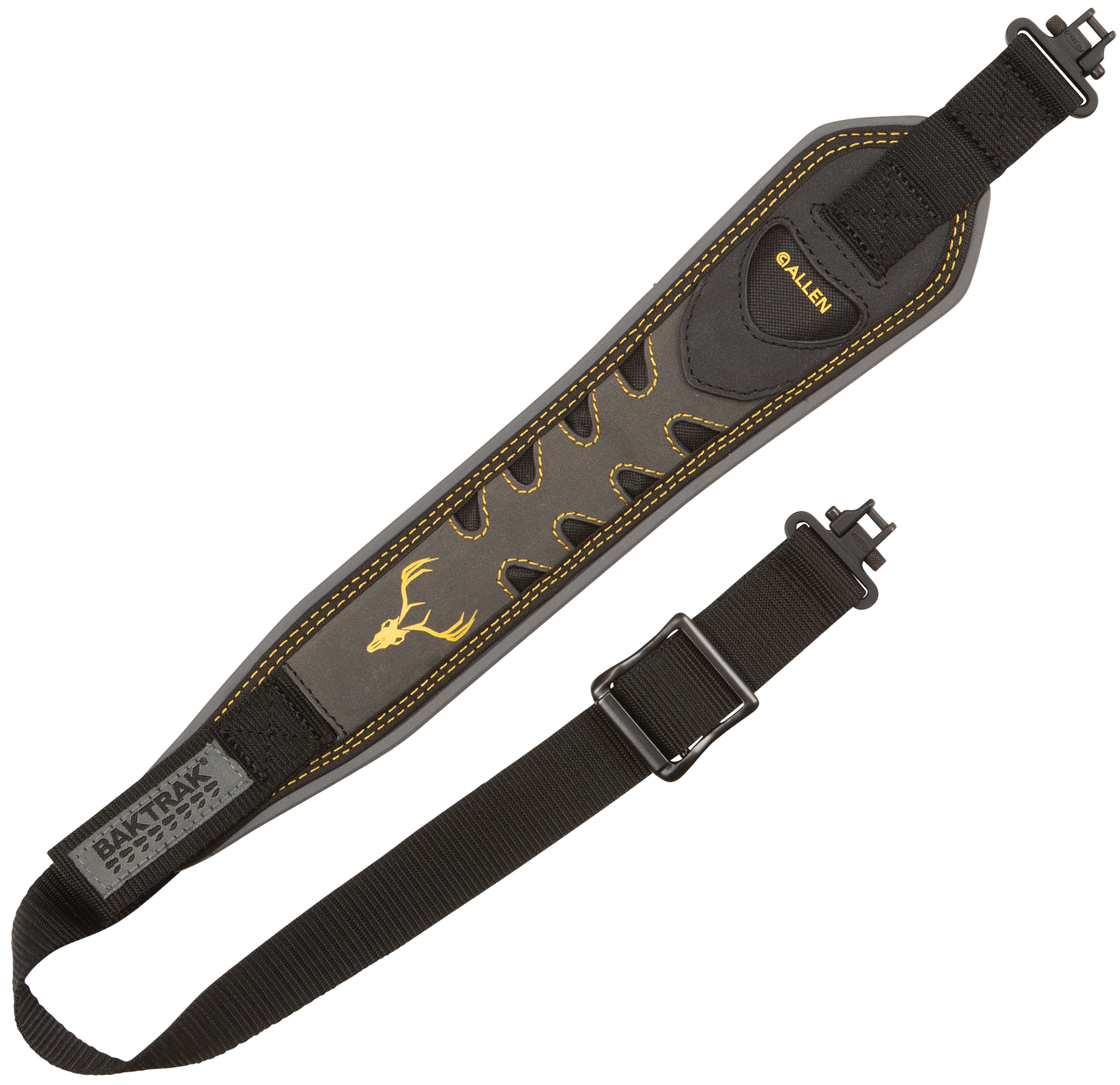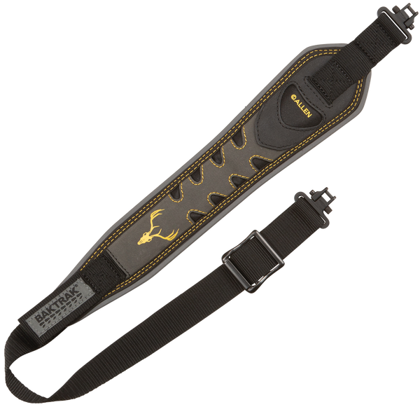 The aspen rifle sling with baktrak by allen has a nubuck leather face with an accent stitch that adds a stylish look to your firearm.It is also equipped with a cleated tread grip back that eliminates sling related noise.With heavy-duty 1.25-inch webbing and swivels tested to 500 pounds, it can be used on smaller rifles to your larger guns.Adjust the sling on the fly with its one-handed, quick-adjusting feature.