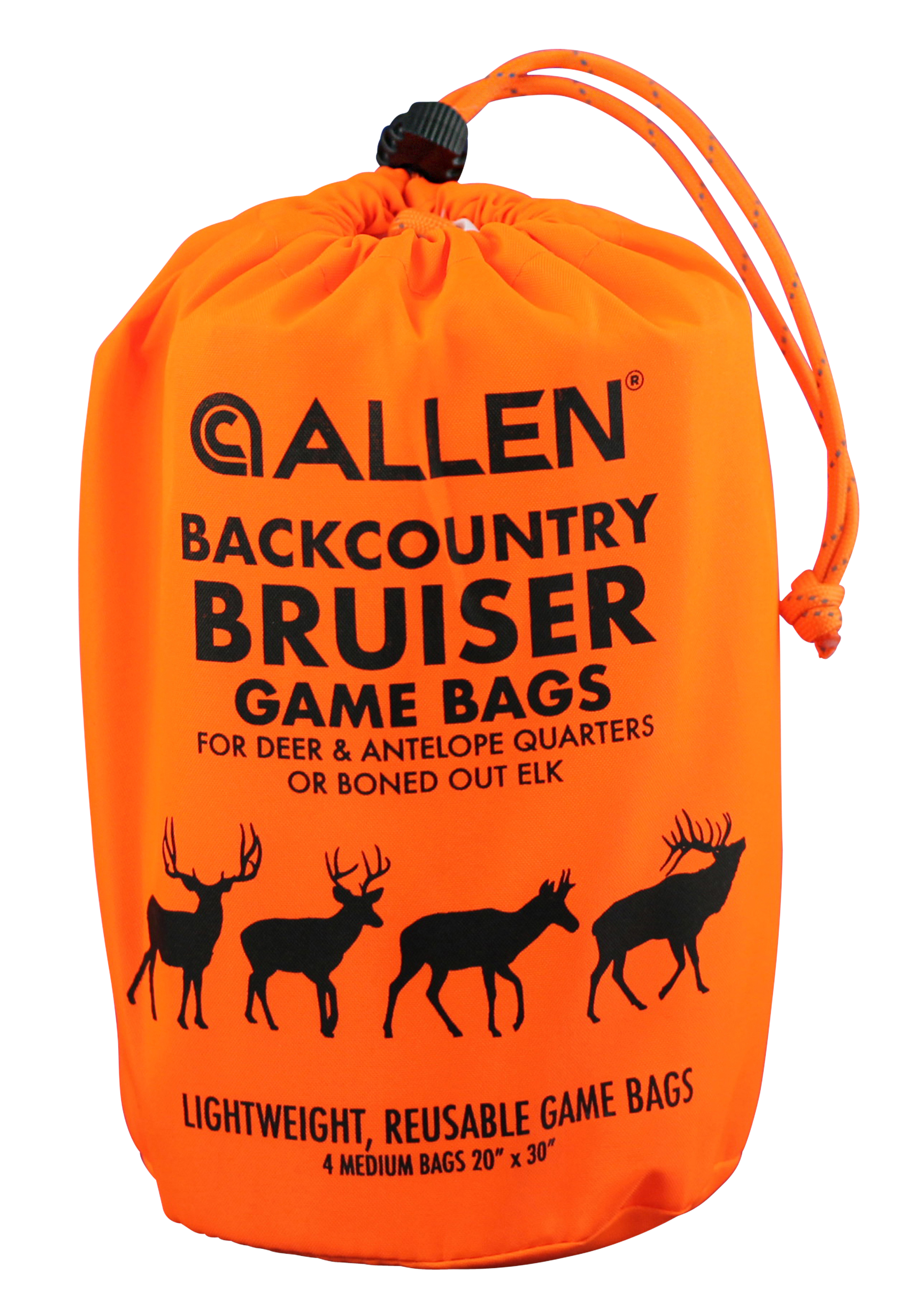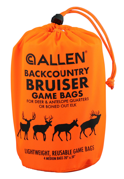 The backcountry bruiser deer game bag set contains four quarter bags 20" wide x 30" long, and a storage pouch.Features ultra-light, washable and reusable with strong construction to securely hold elk quarters and boned out meat; reflective draw cord with cinch toggle keeps the bag securely closed and easy to find in the dark; breathable, wicking material; blaze orange storage pouch is easy to find and keeps you organized; bags are labeled with size and washing instructions for easy reference and identification.