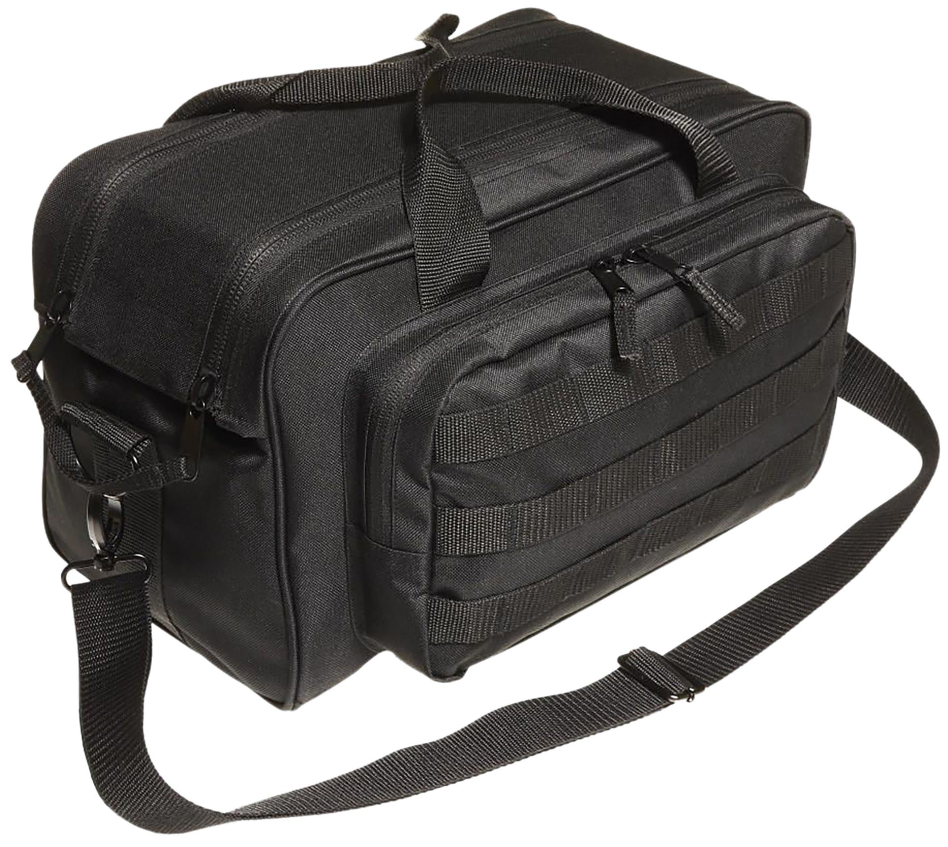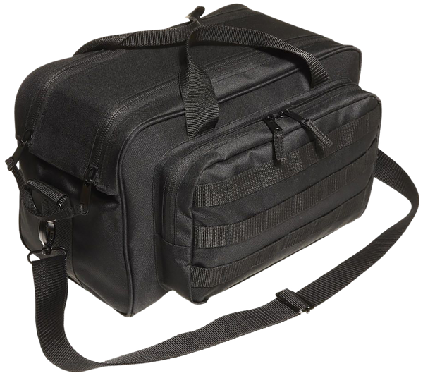 This classic black range bag has a 15" x 8" x 8.5" main compartment and a 12" x 6" x 1" exterior pocket as well as three rows of molle loops.Features detachable shoulder strap with metal hardware, padded pistol rug and a hard bottom liner.