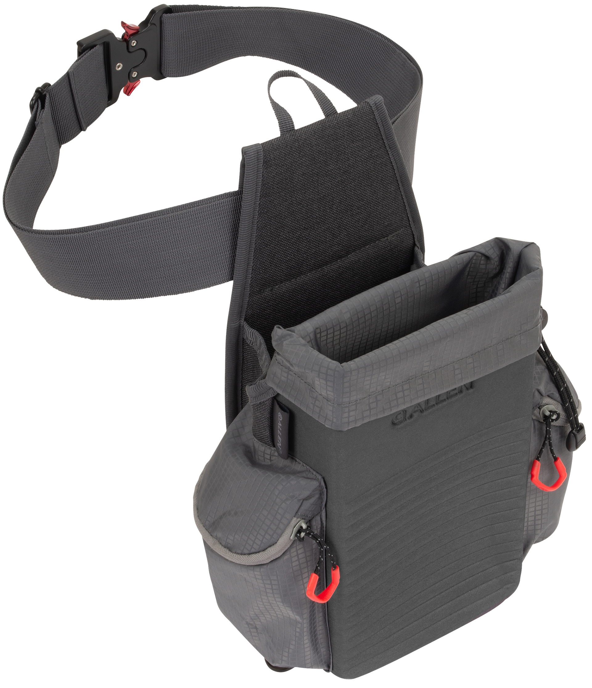 The competitor all-in-one shell bag by allen is designed for the serious trap and skeet shooter.Made from durable, gray, molded eva material and offers the most convenient way to empty your hull bag.When your hull bag is full, roll the top part of the bag up and draw it closed with the drawstring and remove it from the shell bag.Empty the bag into your used shell container and replace the hull bag into the competitor shell bag and you are ready for another round.The shell compartment holds two standard size boxes of 2-3/4 inch 12 gauge shells.Each side has a zippered pocket and a d-ring below it so you can store or attach any accessories you need.The competitor shell bag comes with a 2-inch webbed belt that adjusts up to 52-inches and has a heavy-duty, metal, quick-release buckle.