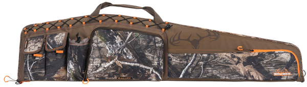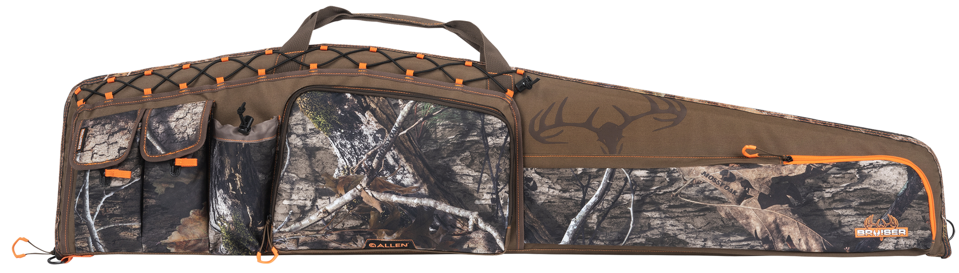 The gear-fit bruiser is purpose-driven and designed to store all the deer hunting essentials you need, from scent and calls to binoculars and more.It features mossy oak country dna camo print, the case fits scoped rifles or shotguns up to 48-inches and features two large pockets designed to store vital supplies needed to hunt.The main pocket features two rows of organization straps to help keep gear protected and organized.The front pocket has ample room for shooting sticks or tripods.Adjustable flap closure to fit large accessories in the front pocket.The rear back pockets are sized to fit boxes of ammo and magazines and a drawstring closure to easily house your scent/cover spray or water bottles.The interior lining is made of heavy-duty dual-density foam material for ultimate protection, made easy to clean.Each compartment is made with heavy-duty zippers, ensuring your weapon and gear are easily accessible.