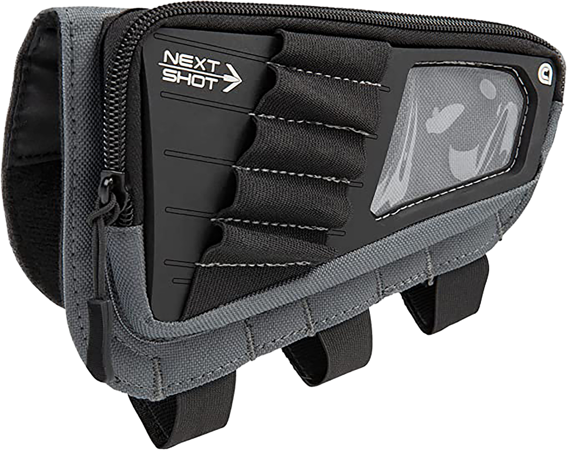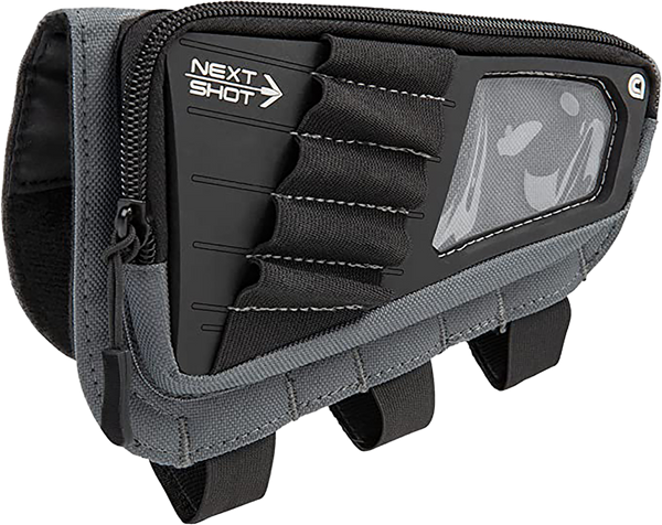 The next shot cody buttstock pouch has adjustable straps that fit most rifles and has elastic loops that can fit from a.223 to a 300 winchester magnum.It features a pouch for a spare magazine or windmeter and a card window to hold your dope card.