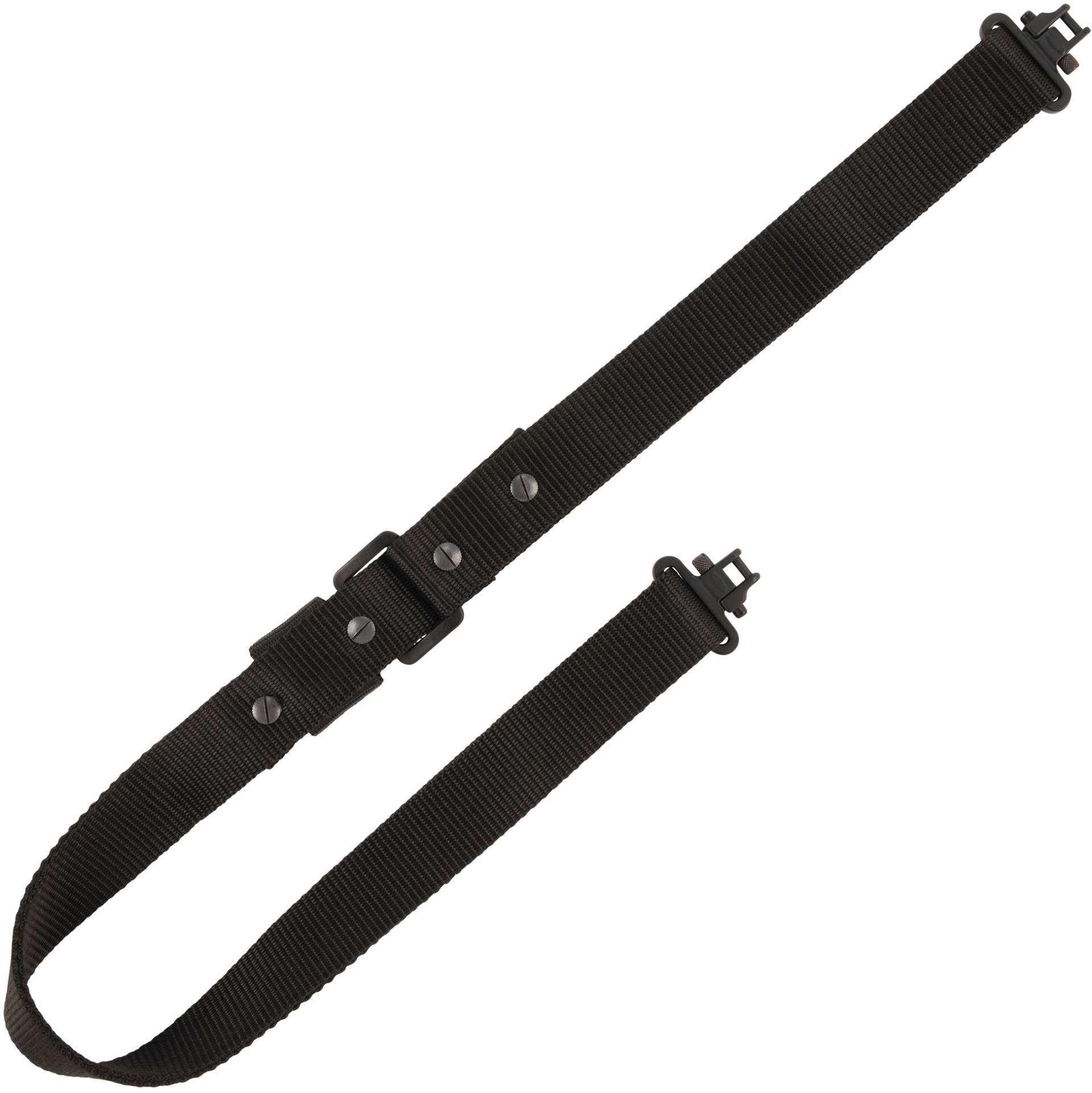 The allen quick adjusting 1.25" sling with black swivels is a design that has proven to be simple to use and very reliable.The sling is adjustable and the swivels are tested to 500 lbs.