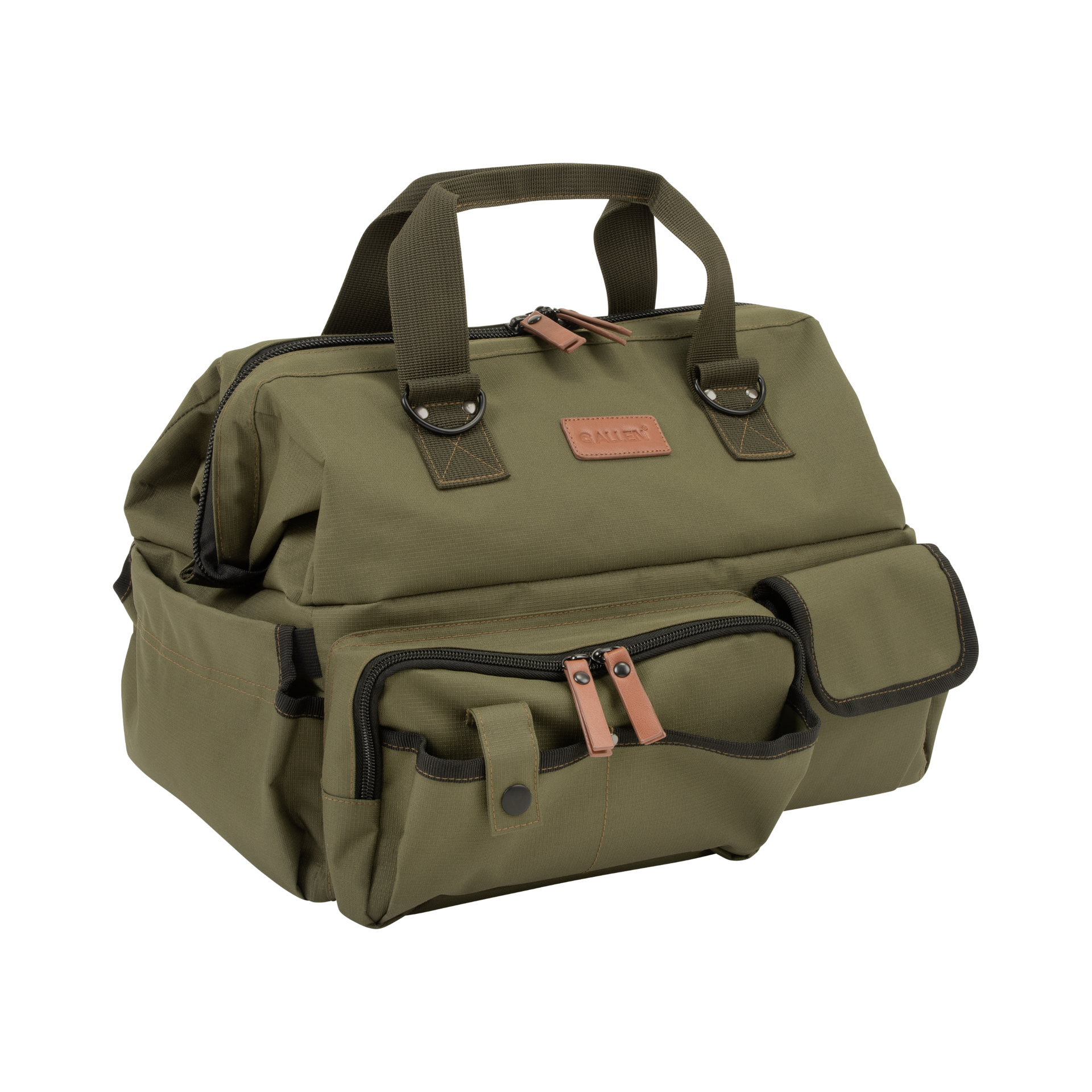 The triumph range bag by allen is a great medium-sized range bag.At 15-inches tall, 10-inches wide, and 12-inches long and made from durable ripstop.This triumph range bag can handle all shooting accessories you need for a day.The center of the bag has a large, zippered, gatemouth type opening allowing it to open very wide.Each end of the bag has a stretch pocket, and the outside of the bag has a zippered pocket to hold extra supplies.A smaller elastic pocket on the outside has five elastic loops inside that securely hold choke tubes or shotgun shells.Inside the case are internal organizer pockets and a removable fold-flat pistol mat.