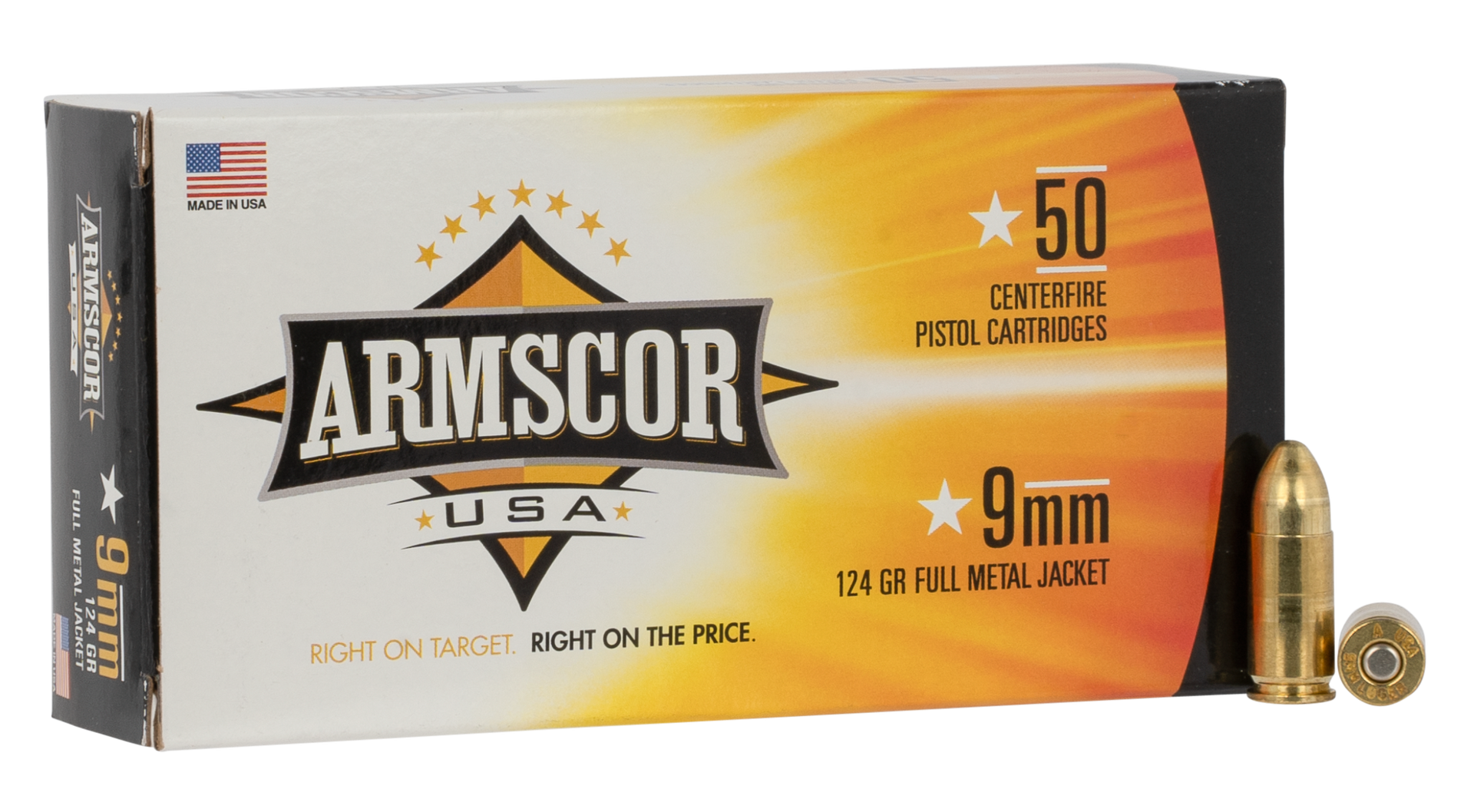 Armscor usa cartridges and components are widely used by the police, military, gun hobbyist, combat shooters, and other shooting enthusiasts due to their high quality, precise and dependable performance.Caliber: 9mm LugerBullet Type: Full Metal JacketBullet Weight: 124 grMuzzle Energy: 348 ft lbsMuzzle Velocity: 1092 fpsRounds Per Box: 50Boxes Per Case: 20Application: Target ShootingCasing Material: BrassHazair: YesView more