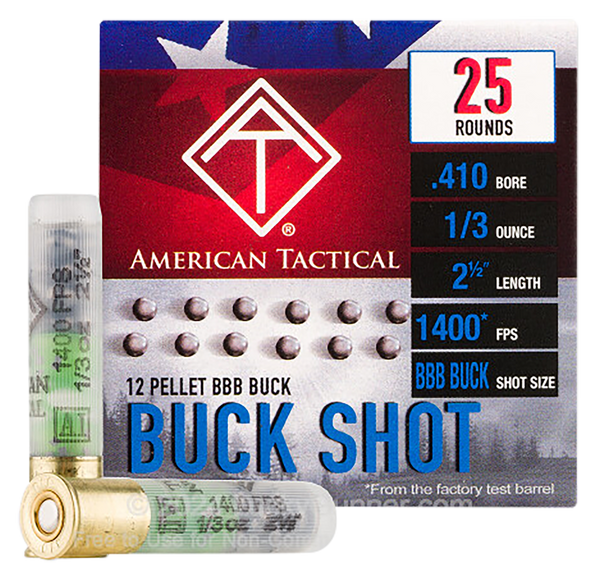 Gauge: 410 GaugeLength: 2.50"Ounces: 1/3 ozShot Size: BBBMuzzle Velocity: 1400 fpsRounds Per Box: 25Boxes Per Case: 10Shot Type: BuckshotHazair: YesView more