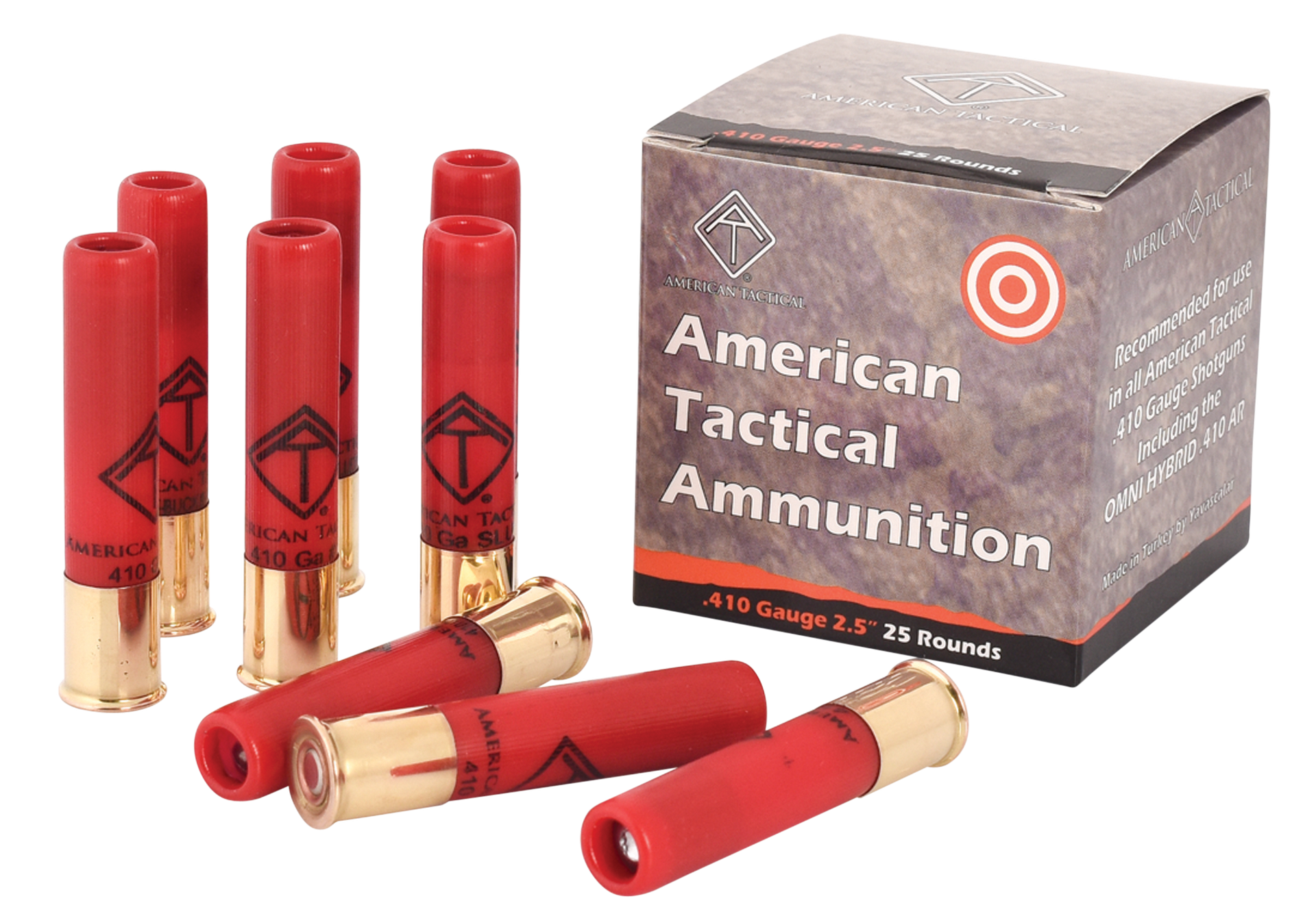 The american tactical 410 rifled slug ammunition features a 2.5" shell and 1410 muzzle velocity.