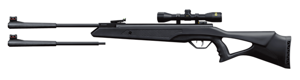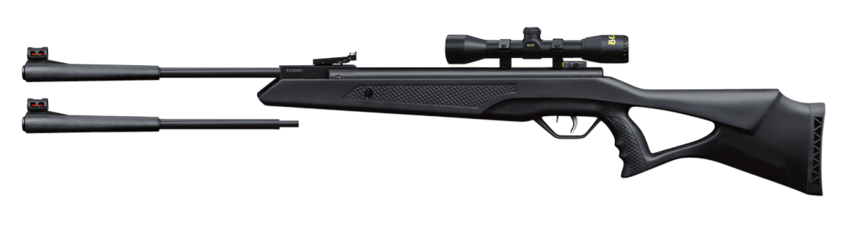 The longhorn ii is a spring piston powered, dual caliber brake barrel air rifle.It features a synthetic stock with a pistol grip, fiber optic sights and a 4x32 scope with mounts.