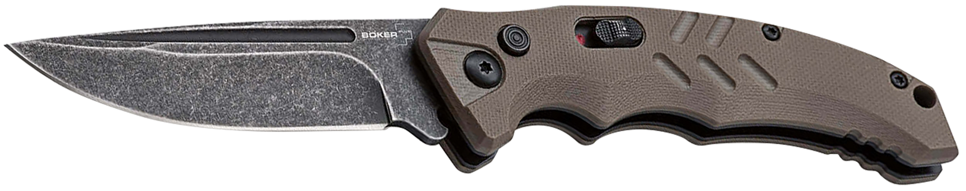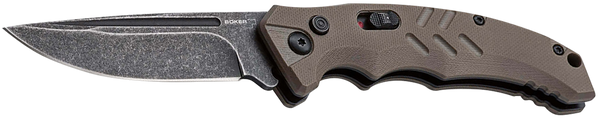 Designed as a tactical automatic knife, the boker plus copes all the cutting tasks that arise in everyday life.Pressing the push button releases the dark stonewash blade made of d2, by the tension of the spring behind it, it then flips open automatically.A clean latching slide lock further secures the knife against accidental release.The ergonomically shaped handle is made of textured g10, ribbing in the area of the thumb rest and the pronounced finger recess further improve the hand position.