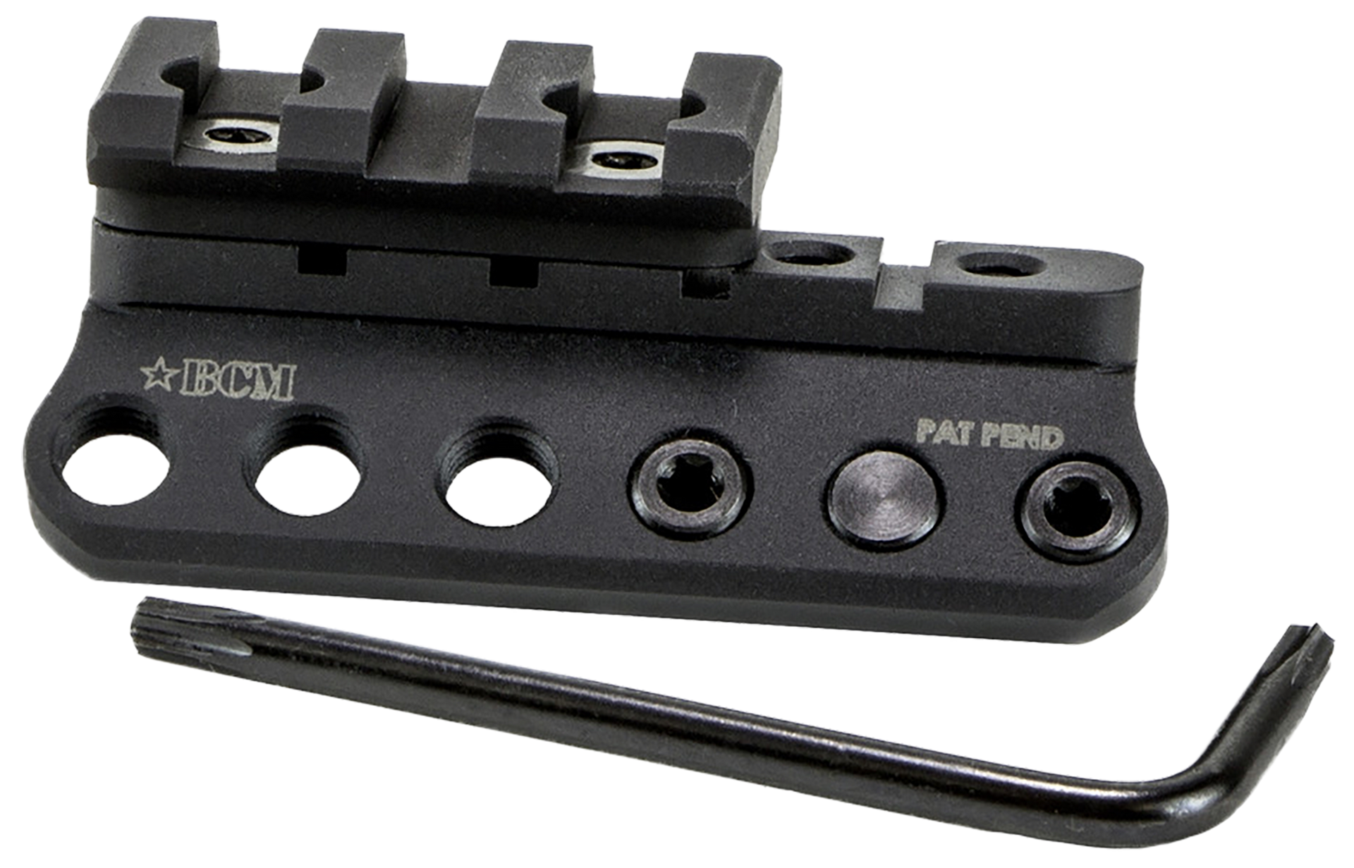 The bcm 1913 light modular mount- keymod is designed for use on most common 1913-rail pistol/weapon light systems.It features multiple mounting holes for ideal placement, designed to mount on the 3 or 9 o'clock rail positions, fully ambidextrous and made to mount flush or cantilever off either the left or right side of the rail system.The light mount is constructed of aluminum and is intently designed to be low-profile and snag-free.Includes 1/8" hex and t15 torx drive wrench.