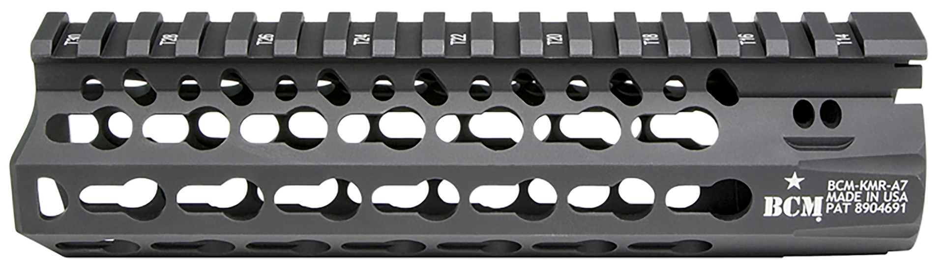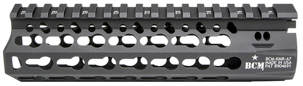 Bravo's kmr alpha is constructed of aluminum with a hardcoat anodized finish for corrosion resistance and is free-floating.Its interface system was developed to work in parallel with the current picatinny system.This rail system allows for a larger range of modularity offering four different offset mounting positions between traditional 3,6,9, and 12:00 positions.Included is a bcm keymod sling mount.This model has a black finish and is 7.39" long.