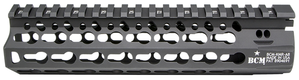 Bravo's kmr alpha is constructed of aluminum with a hardcoat anodized finish for corrosion resistance and is free-floating.Its interface system was developed to work in parallel with the current picatinny system.This rail system allows for a larger range of modularity offering four different offset mounting positions between traditional 3,6,9, and 12:00 positions.Included is a bcm keymod sling mount