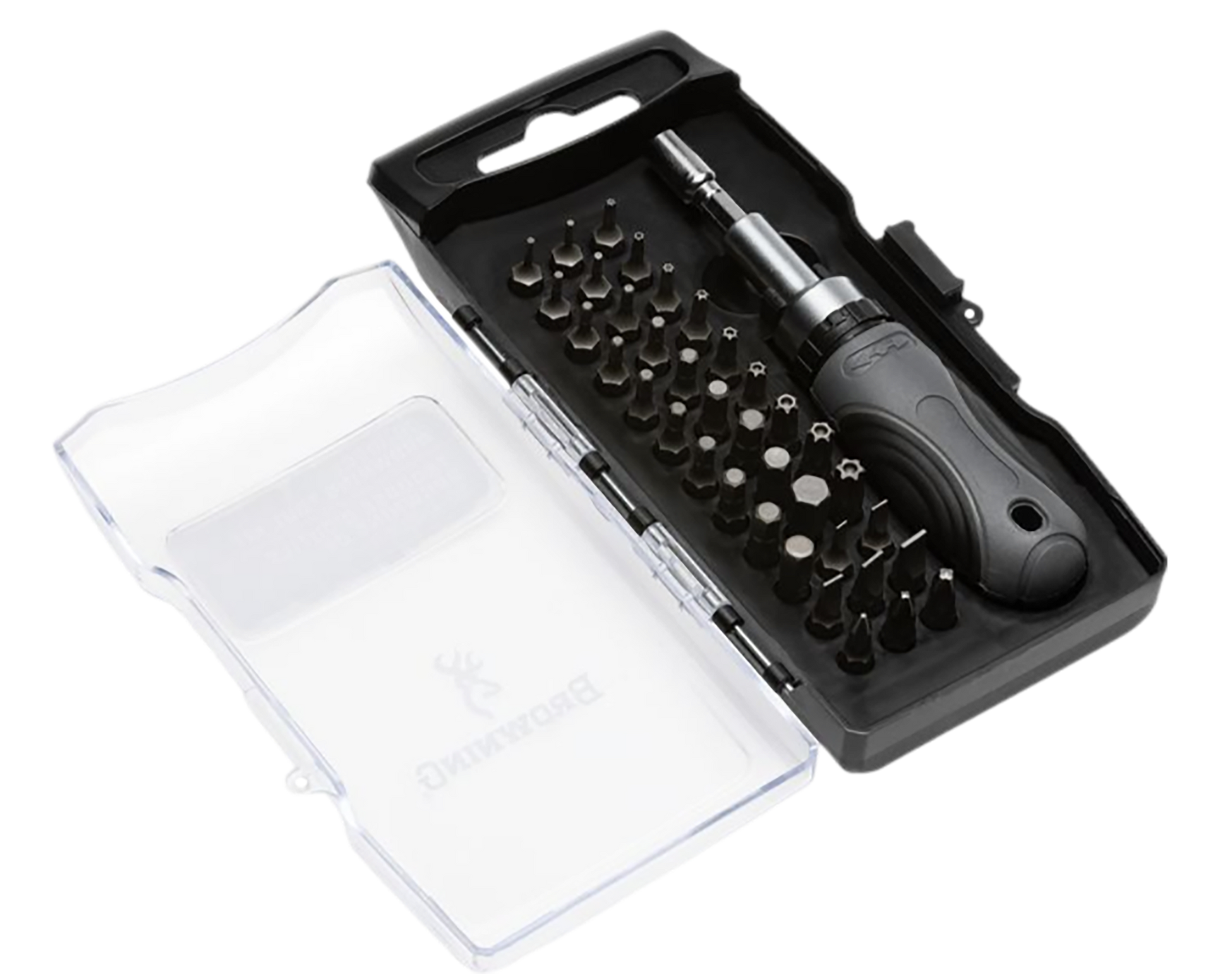Firearm tool kit includes metric, sae hex, torx, phillips, and flathead bits with ratcheting screwdriver and extension.38-piece set for gun and optic assembly/disassembly.