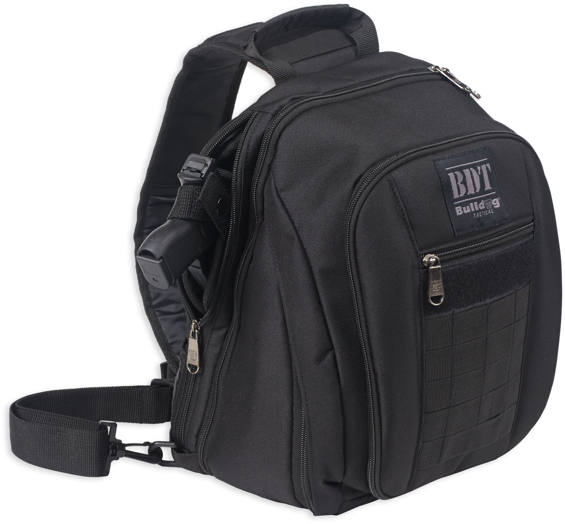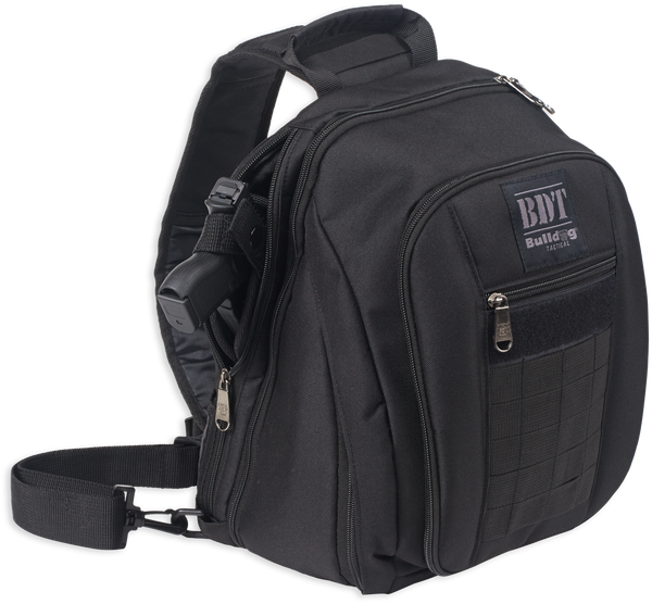 Bulldog's small sling pack has deluxe all metal zippers and zipper pulls.Its main padded compartment is ideal for mini or regular sized tablets, and can hold accessories and magazines.It also has a padded shoulder sling and an included universal holster.