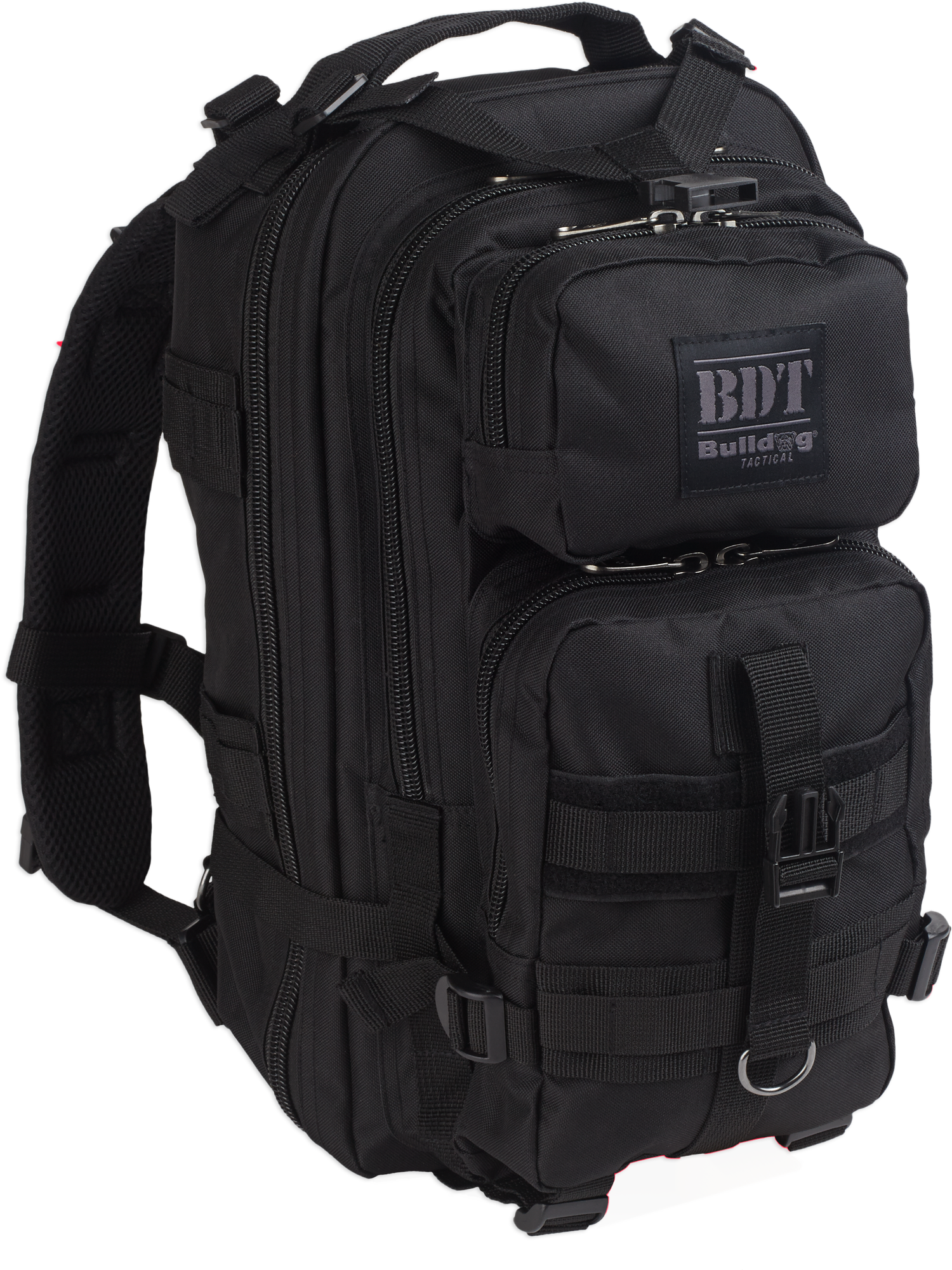 The bulldog tactical compact backpack has 2 main compartments, 2 accessory compartments, 1 hydration bladder compartment, heavy-duty metal zippers pulls, durable drag /carry handle, deluxe comfort backpack straps, molle & alice compatible, 18h x 10w x 10d