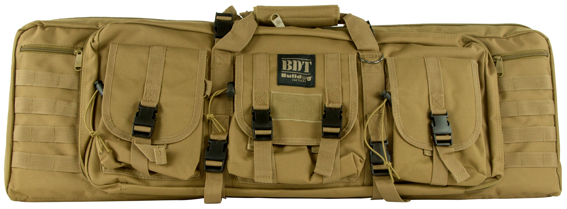 Bulldog's tactical rifle case features a lockable zippered rifle compartment with adjustable velcro tie downs and quilted lining.It is constructed of a heavy-duty nylon with oversized metal zippers and pulls, deluxe padded backpack straps, and three high-vis lined accessory pockets for added visibility.The case also has a lockable zippered accessory and extra magazine compartment as well as a padded internal divider which allows for double the rifle storage.