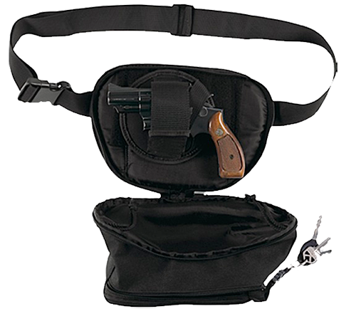 The fanny pack pistol holster by bulldog is an ambidextrous universal holster with a full-length zipper, quick release pulls for quick access.And nylon wrap-around carry straps.This model is made with heavy-duty nylon and the outer shell is water-resistant.Fits waist up to.50".