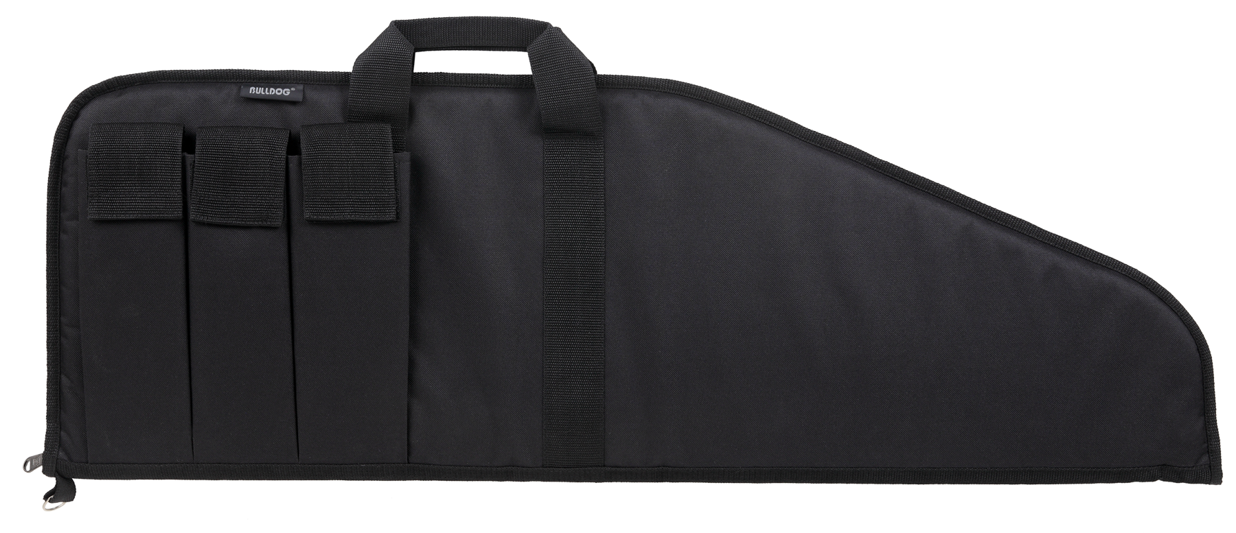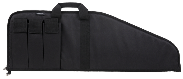 The pit bull case has a water-resistant durable outer shell and a heat-resistant inner lining that won't stick to barrels.It has 1.75" total padding, a deluxe zipper with zipper pulls and three external magazine pouches with velcro flaps.This case fits rifles up to 41" and it floats.