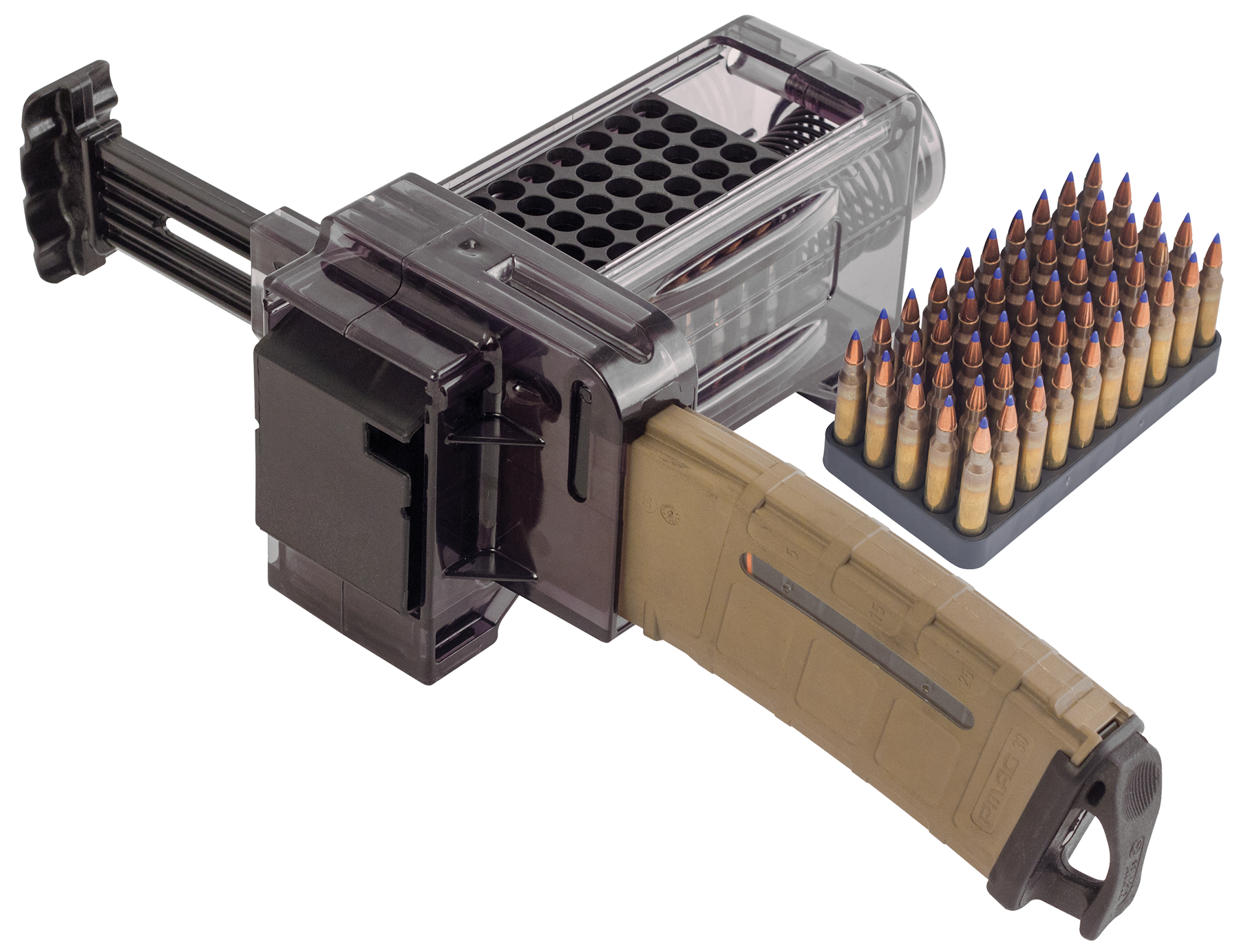 Caldwell's ar-15 mag charger is designed to accept loaded rounds directly from any 50-round ammo manufacturer box or from aftermarket 50-round plastic storage boxes.The entire process of filling the mag charger and loading all 50 rounds into two magazines takes less than 15 seconds.The ar-15 mag charger includes an ammo transfer tray to invert ammo positioned in boxes with the bullet tips down or to stage bulk ammo.Highly durable poly-carbonate construction, the mag charger is compatible with.223, 5.56 and.204 ammo.