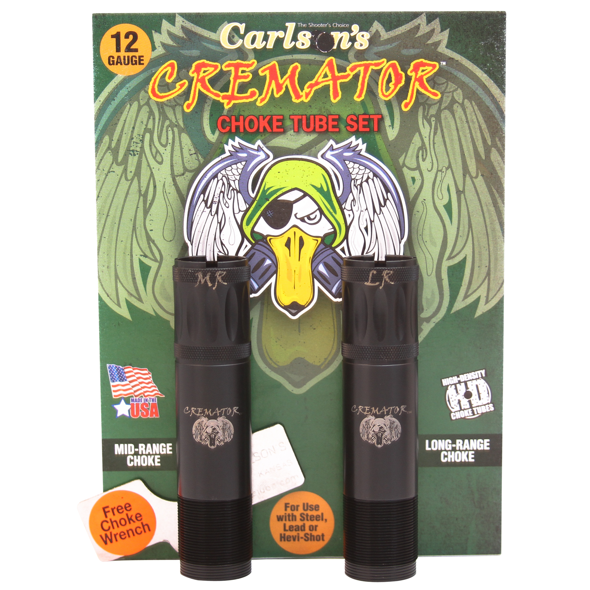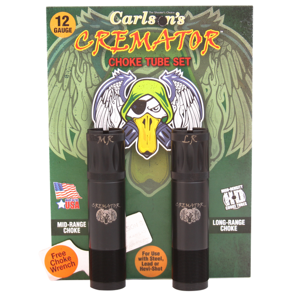 Carlson's cremator choke tubes feature our new triple shot technology and is offered in close mid and long range constrictions.Tst is a series of three graduated rings in the taper section of the choke tube, that allow a more gradual transition from the shotgun bore to the final constriction.The cremator offers reduced pellet deformation, less flyers, more dense patterns, wrench-less installation, quick removal and muzzle protection.Made in the usa.*note- optima hp and remington pro bore long range cannot be used with any steel shot larger than #2.