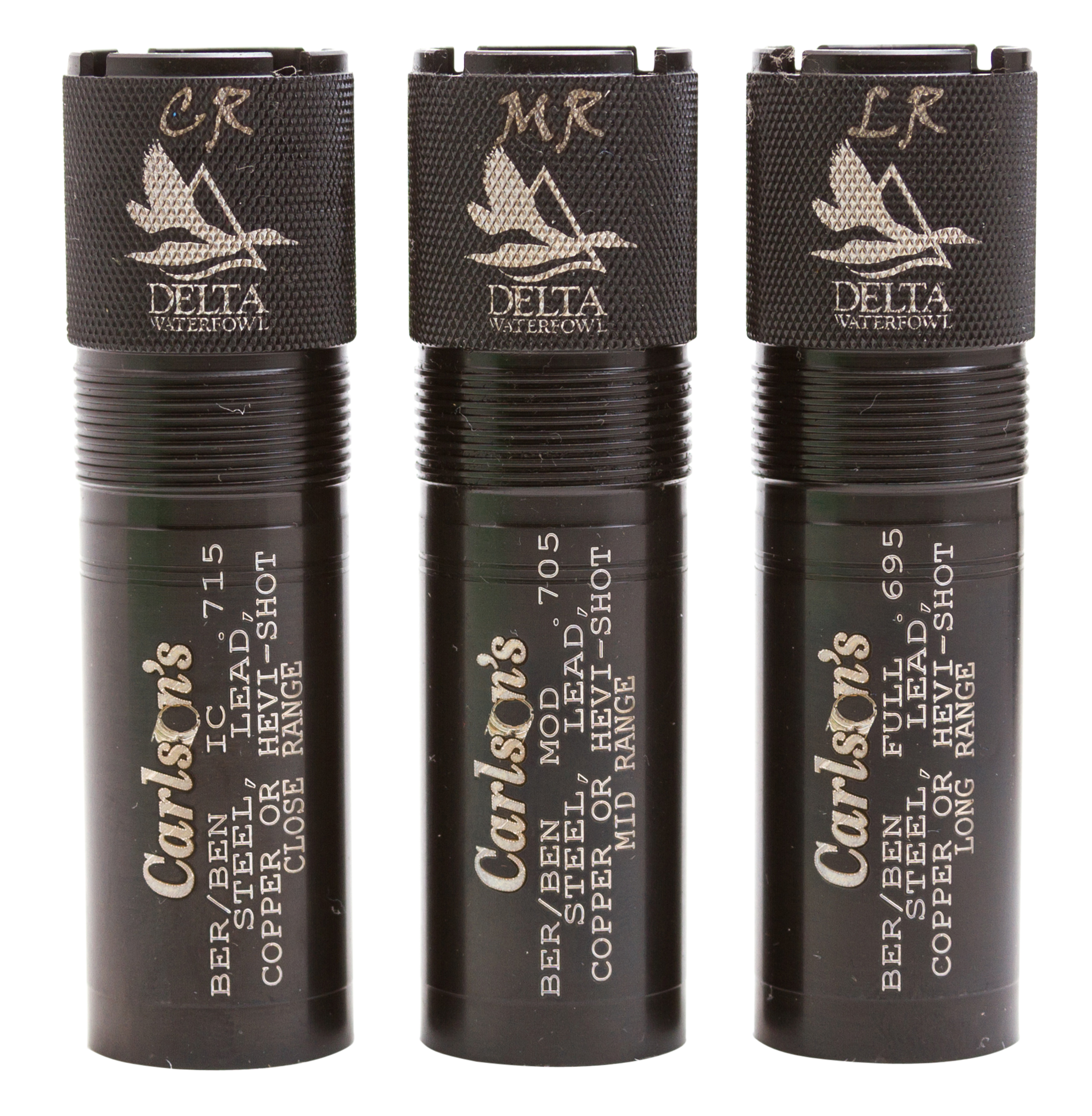 Carlson's waterfowl choke tubes are manufactured from 1704 stainless steel and designed to throw tighter and denser patterns than conventional choke tubes.These choke tubes feature a 25% longer parallel section in the choke, thus throwing more consistent patterns.Each choke tube is knurled on the end to allow for quick and easy removal.Each choke tube has the constriction and size laser marked on the end and body for easy reference.Steel shot may be used through these choke tubes with exceptional results.*note- do not shoot steel shot larger than bb or any steel load faster than 1550 fps through the full or extra full constrictions.Slugs, sabots, and rifled slugs are not to be used in any choke constriction tighter than improved cylinder.Remember to pattern your shotgun choke tube with the specific shotshell load you are going to be using.Different brands of ammunition throw different patterns from the same choke tube.