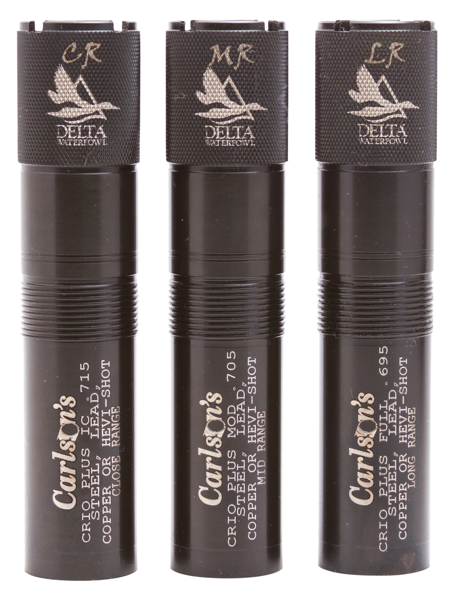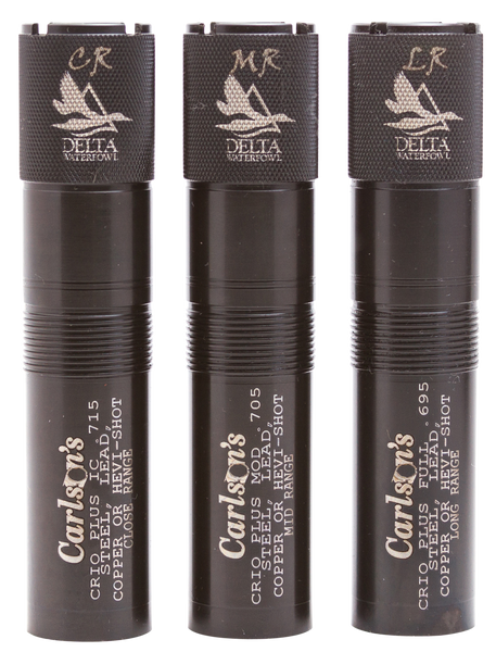 Carlson's waterfowl choke tubes are manufactured from 1704 stainless steel and designed to throw tighter and denser patterns than conventional choke tubes.These choke tubes feature a 25% longer parallel section in the choke, thus throwing more consistent patterns.Each choke tube is knurled on the end to allow for quick and easy removal.Each choke tube has the constriction and size laser marked on the end and body for easy reference.Steel shot may be used through these choke tubes with exceptional results.*note- do not shoot steel shot larger than bb or any steel load faster than 1550 fps through the long rang constriction.Loads that exceed this size and speed should be used with the mid range choke tube.