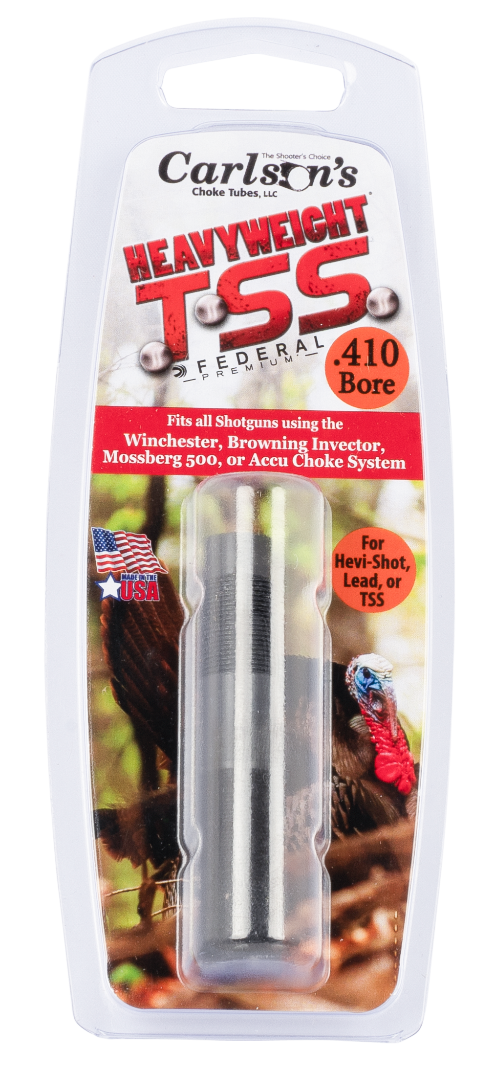 Carlson's tss turkey choke tubes are optimized for federal premium heavyweight tss turkey loads but also work well with other manufacturer's turkey ammunition (smaller shot size 7-9).The federal premium's heavyweight tss turkey load has an incredibly high pellet count in both 7 and 9 shot, along with their ability to carry energy further, makes them ideal for.410, 20ga and 12ga.Tungsten super shot (tss) has a...View more