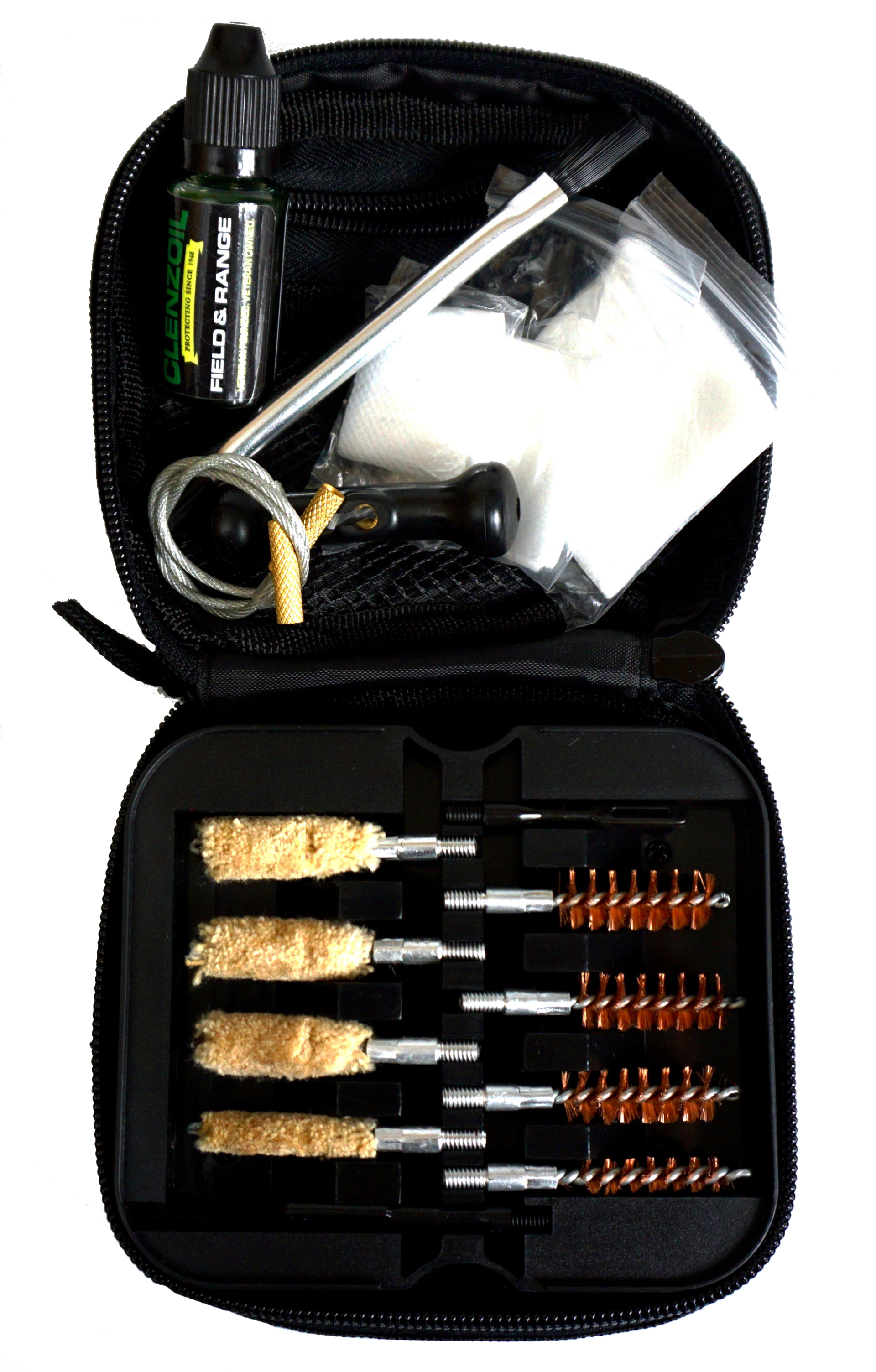 The clenzoil multi-caliber pistol kit includes clenzoil field and range dropper 5oz;.22 cal-.45 cal bore brushes and mops; 12" cable with handle, scrubbing brush, 2 sizes of patch pullers, 3 sizes of cotton patches and a nylon water resistant case.