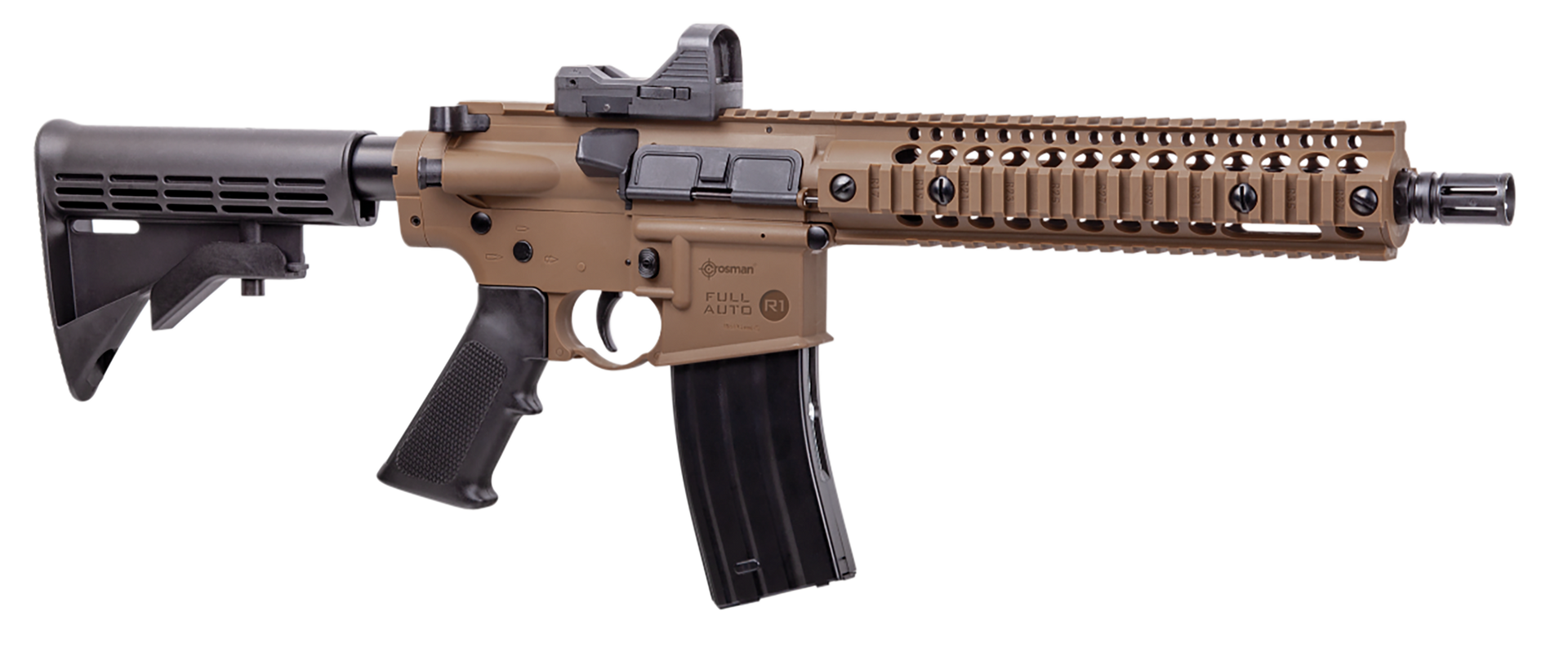 The crosman full auto r1 bb air rifle maximizes backyard fun! fueled by two 12-gram co2 cartridges and a 25 round drop out magazine, you will have target cans flying in no time.The rifle features a genuine feel, familiar controls and an intense 1400 round per minute rate of fire, all at a jaw dropping rate of up to 430 fps.Even better, the rifle is...View more
