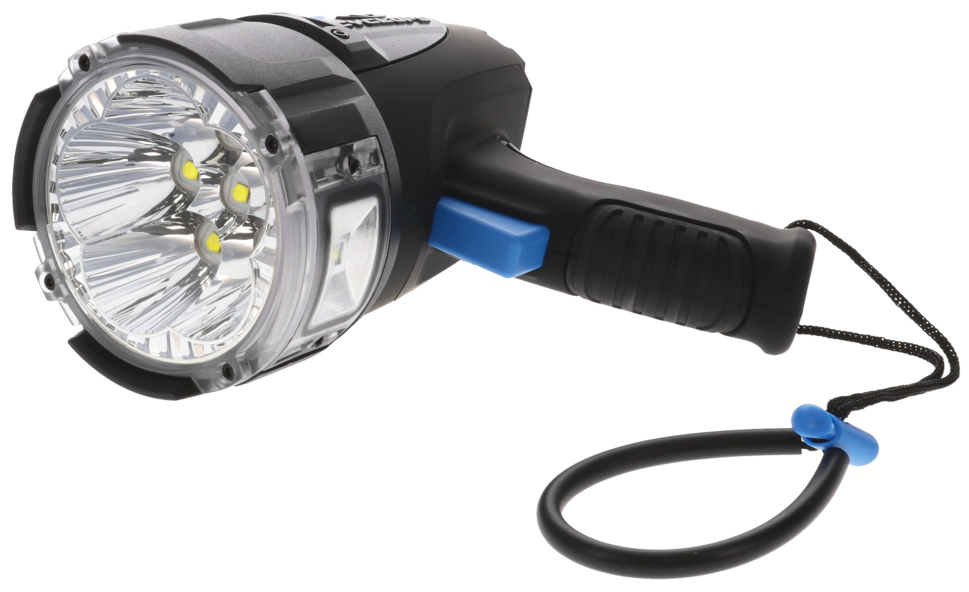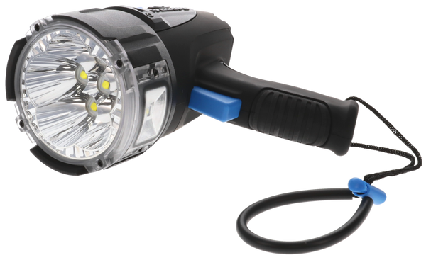 The cymax rechargeable spotlight features up to 10,000 lumens; 6x usa cree xhp50.2 super bright led (total 110w); low/high/s.O.S.; bottom ffodlight 1x usa cree xp-g3 super bright 6w led and rubberized lanyard.Includes flip stand for ground use, usb and 12v auto charger.